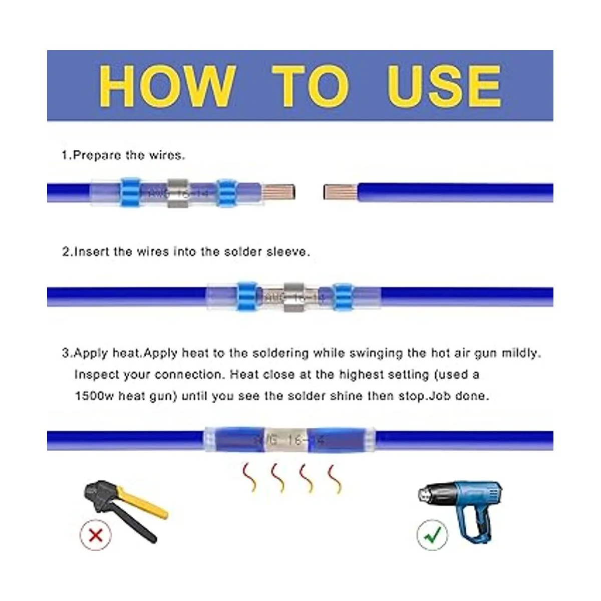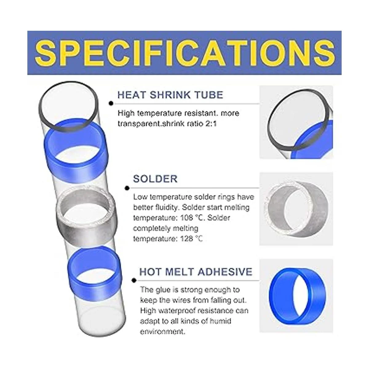 Fiabilidad a largo plazo: podemos manejar entornos complejos de conexión de cableado. Por qué Los conectores para cableado de sellado de soldadura están hechos de materiales de etilvinilacetato EVA claramente permiten al usuario ver la calidad de la penetración de soldadura. El tubo termorretráctil es resistente a la abrasión y protege el cable.