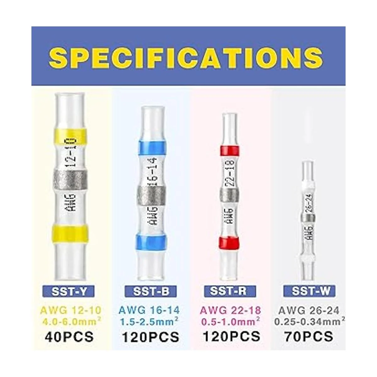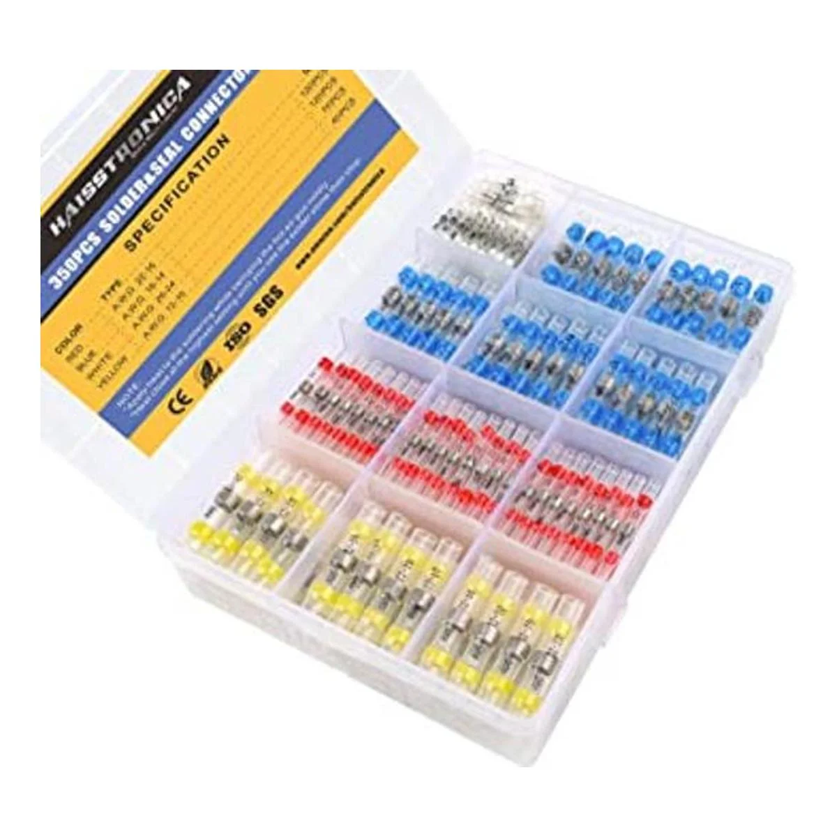 haisstronica Kit de 350 conectores de alambre de sellado de soldadura, conectores de alambre termorretráctil de grado marino de calibre 2610, conectores a tope impermeables, conectores eléctricos aislados y empalme trasero 4 colores4 tamaño