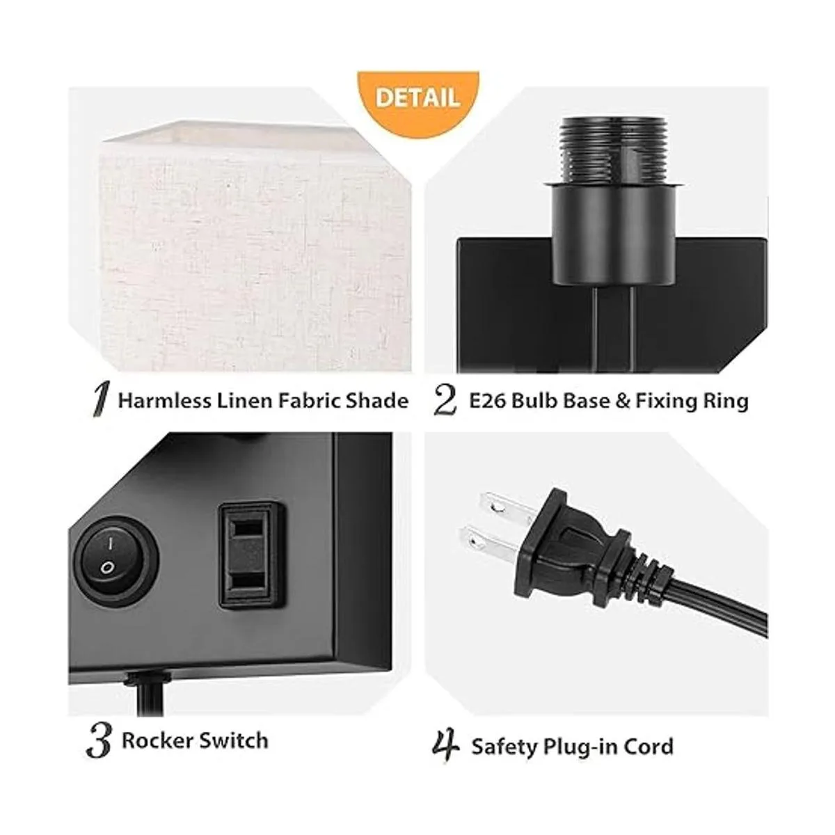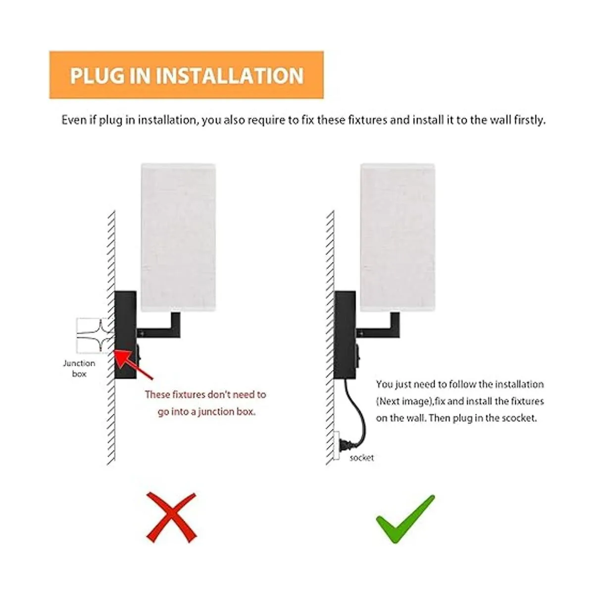 Instalación solo enchufe Los apliques de iluminación de pared solo soportan la instalación de enchufe, por lo que estos accesorios de pared no necesitan entrar en una caja de conexiones, pero necesitan fijarlos e instalarlos en la pared primero y luego enchufarlos en el enchufe. Fácil de instalar El cable de enchufe es de 63 pulgadas de largo y ha pasado la certificación UL. También es una opción segura y fiable para ti