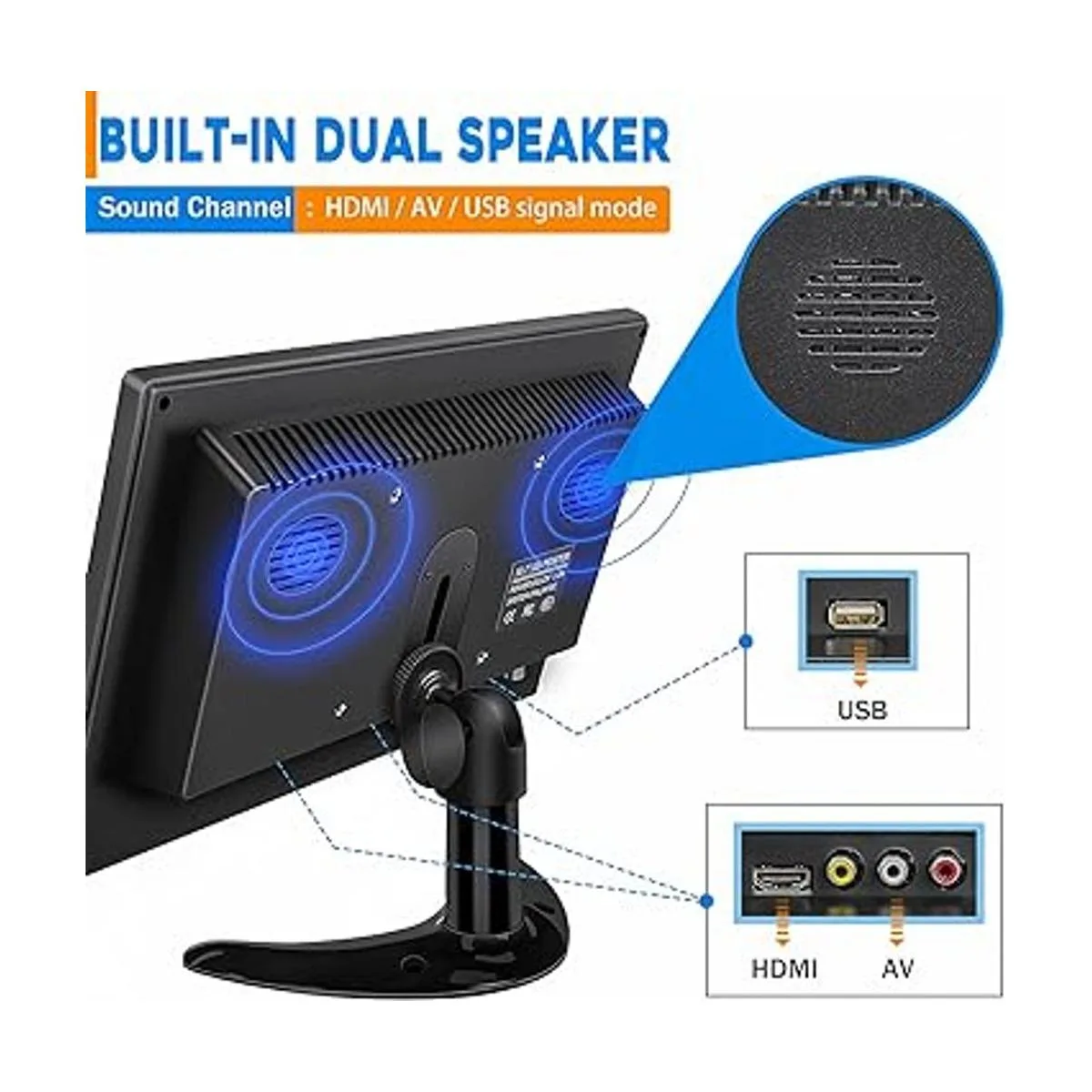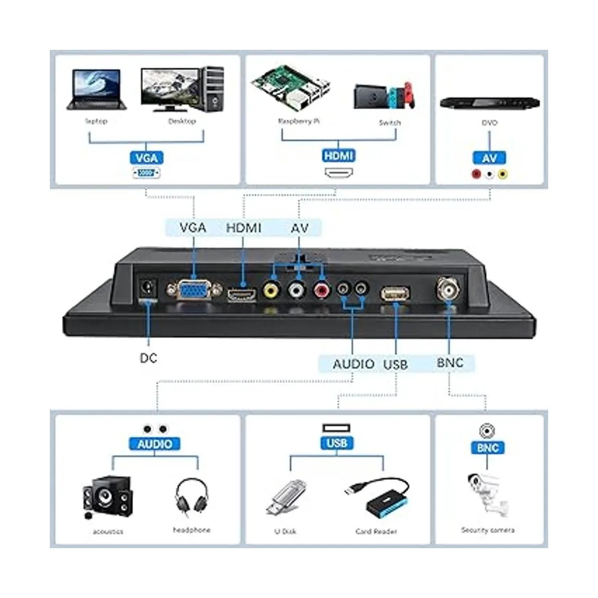 Multifuncional: el monitor es multifuncional y está diseñado para satisfacer los diferentes deseos de uso de diferentes clientes. Proporciona varios puertos de entrada de video diferentes, incluyendo 1 puerto HDMI para juegos, Raspberry Pi, DSLR, DVR u otros dispositivos con uso de puerto HDMI, conectando con un TVstick, se puede utilizar como un pequeño televisor. 1 puerto VGA para computadora o portátil. 1 puerto AV para DVD, VCD, TV Box o cámara de seguridad que tiene puerto AV, etc.