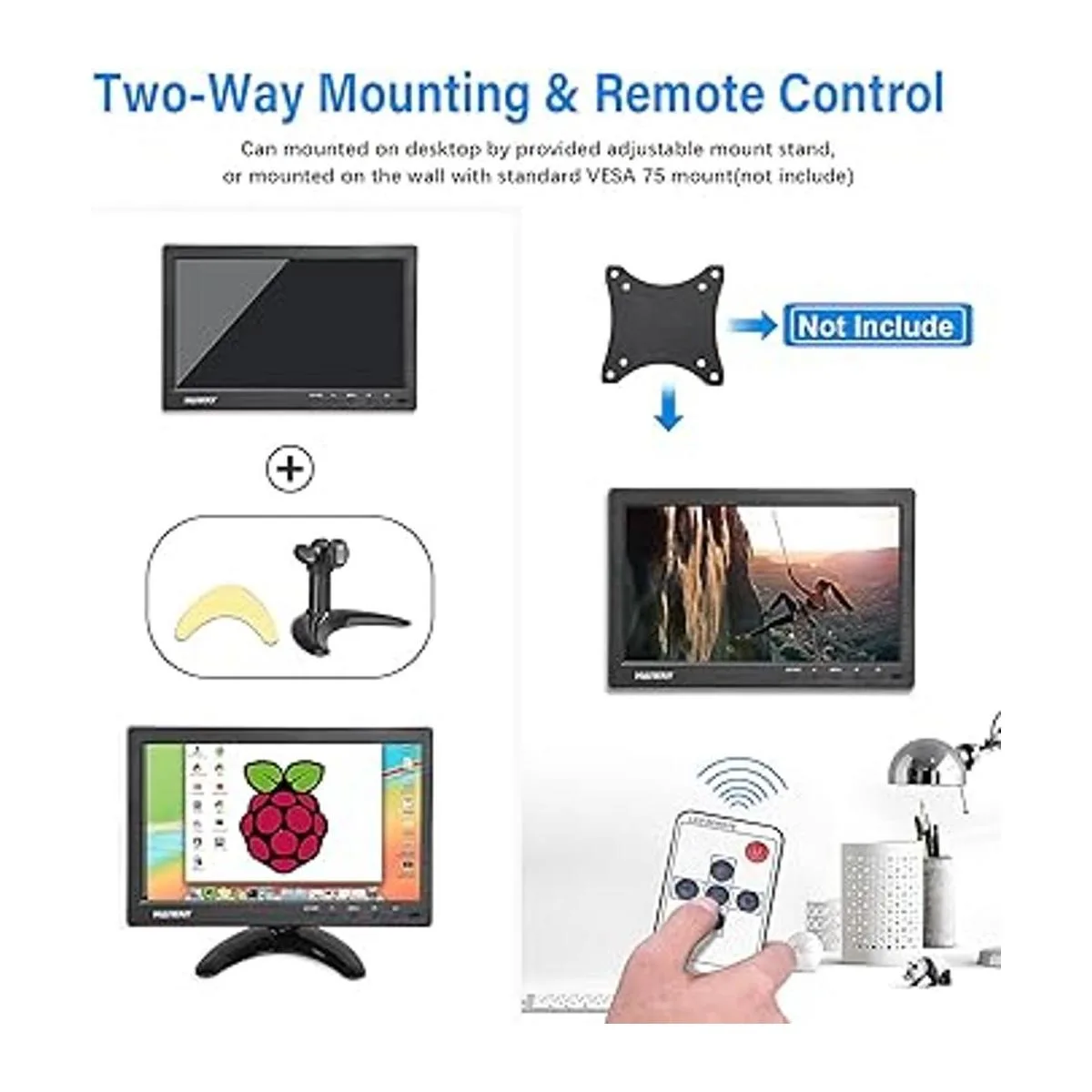 Instalación bidireccional y vistas de gran angular: el monitor portátil se puede montar fácilmente en la pared con el soporte VESA 75 estándar de la industria no incluido o montar en el escritorio mediante el soporte de montaje ajustable proporcionado. El ángulo de visión horizontal y vertical de 150 grados ofrece una visión clara de la pantalla desde una variedad de puntos de vista.