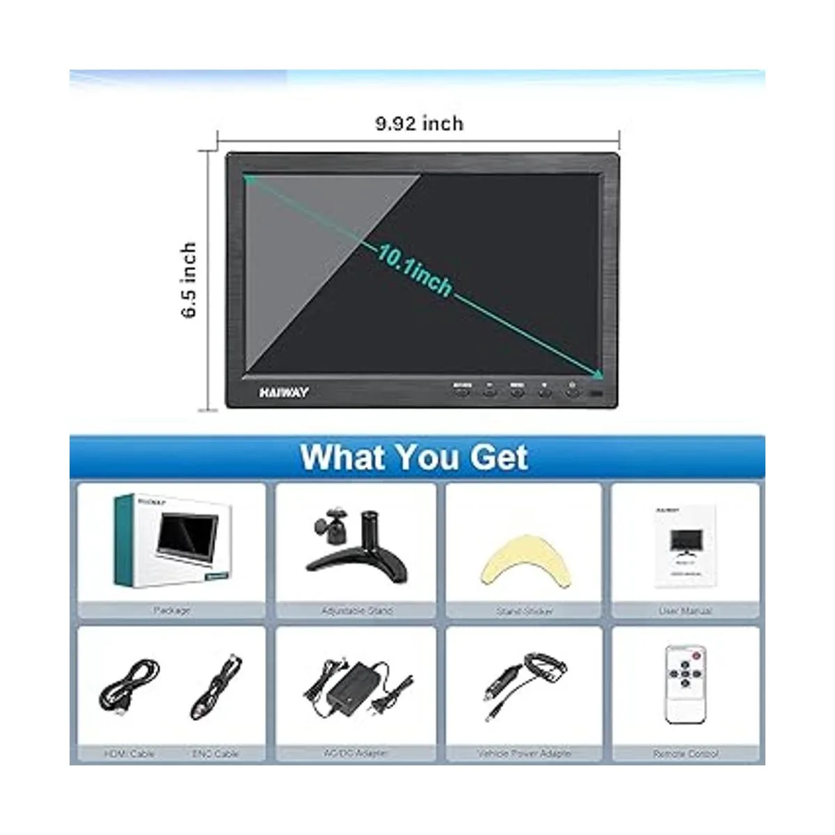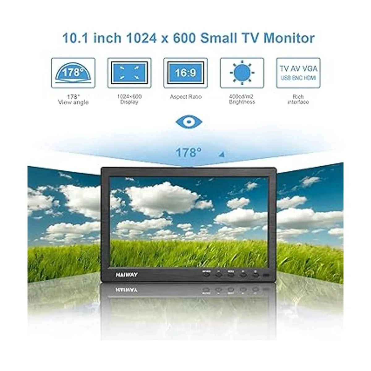 Alta resolución: el impresionante monitor LED Haiway de 10.1 pulgadas con resolución HD 1024 x 600, relación de contraste dinámico 400:1, brillo de 400 cd/m2, relación de aspecto 16:9 y amplio ángulo de visión demuestran una capacidad de imagen súper exclusiva y ofrece a los usuarios una experiencia de uso espectacular.