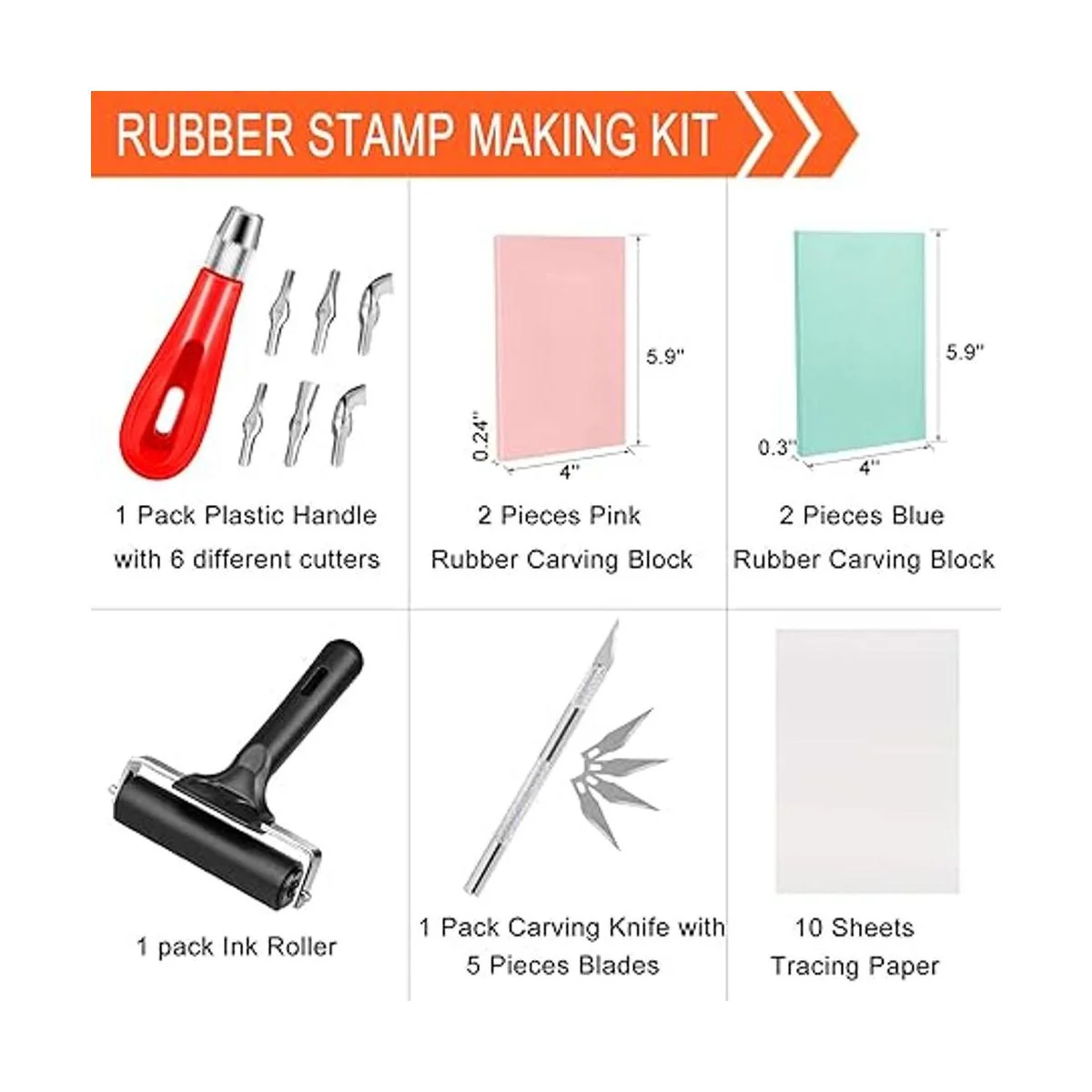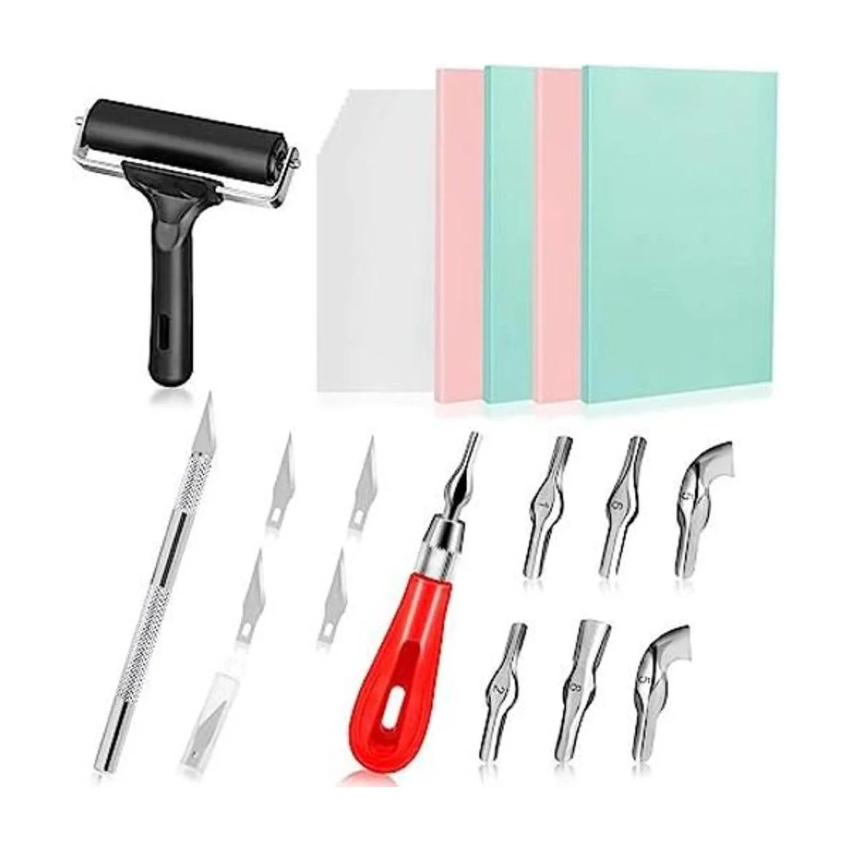 Hakkin Kit de fabricación de sellos de goma, kit de herramientas de inicio de impresión de bloques, cortador de linóleo con 6 cuchillas de tipo, bloque de tallado de goma, papel de calcar, cuchillo de tallado con 5 cuchillas, rodillo de trenzado para sello
