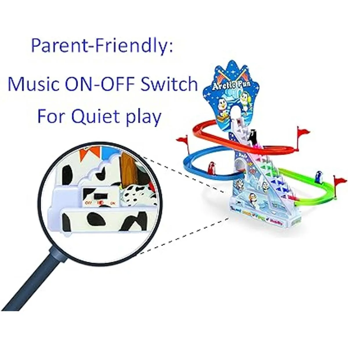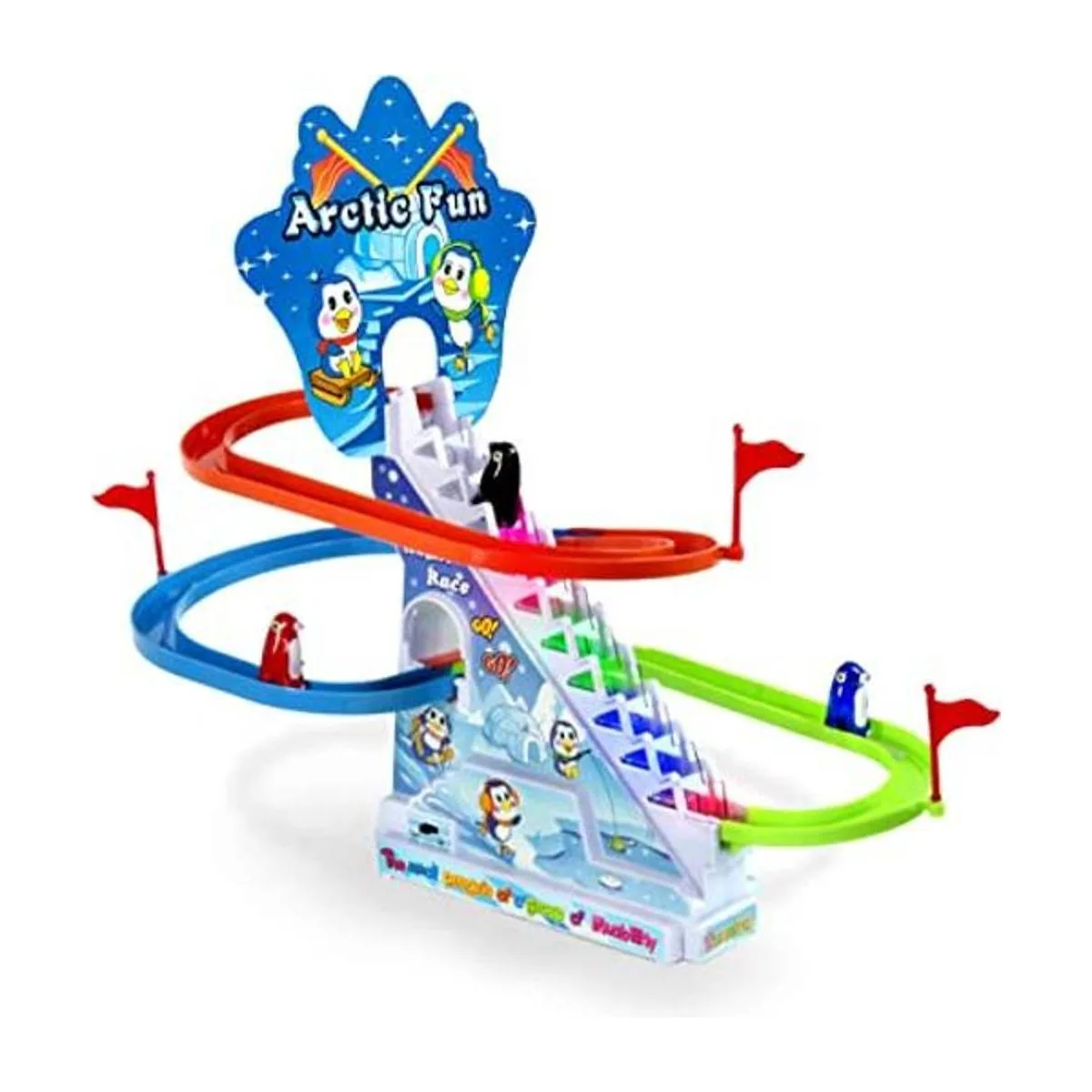 Ahora con interruptor de encendido/apagado de música 3 pinginos alegres suben las escaleras y se deslizan alegremente por la pendiente. Diversión fascinante.
