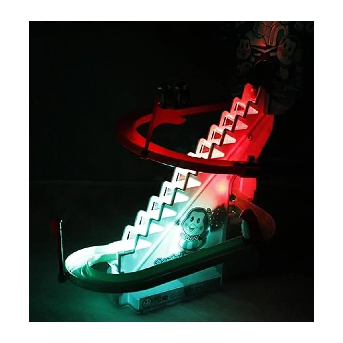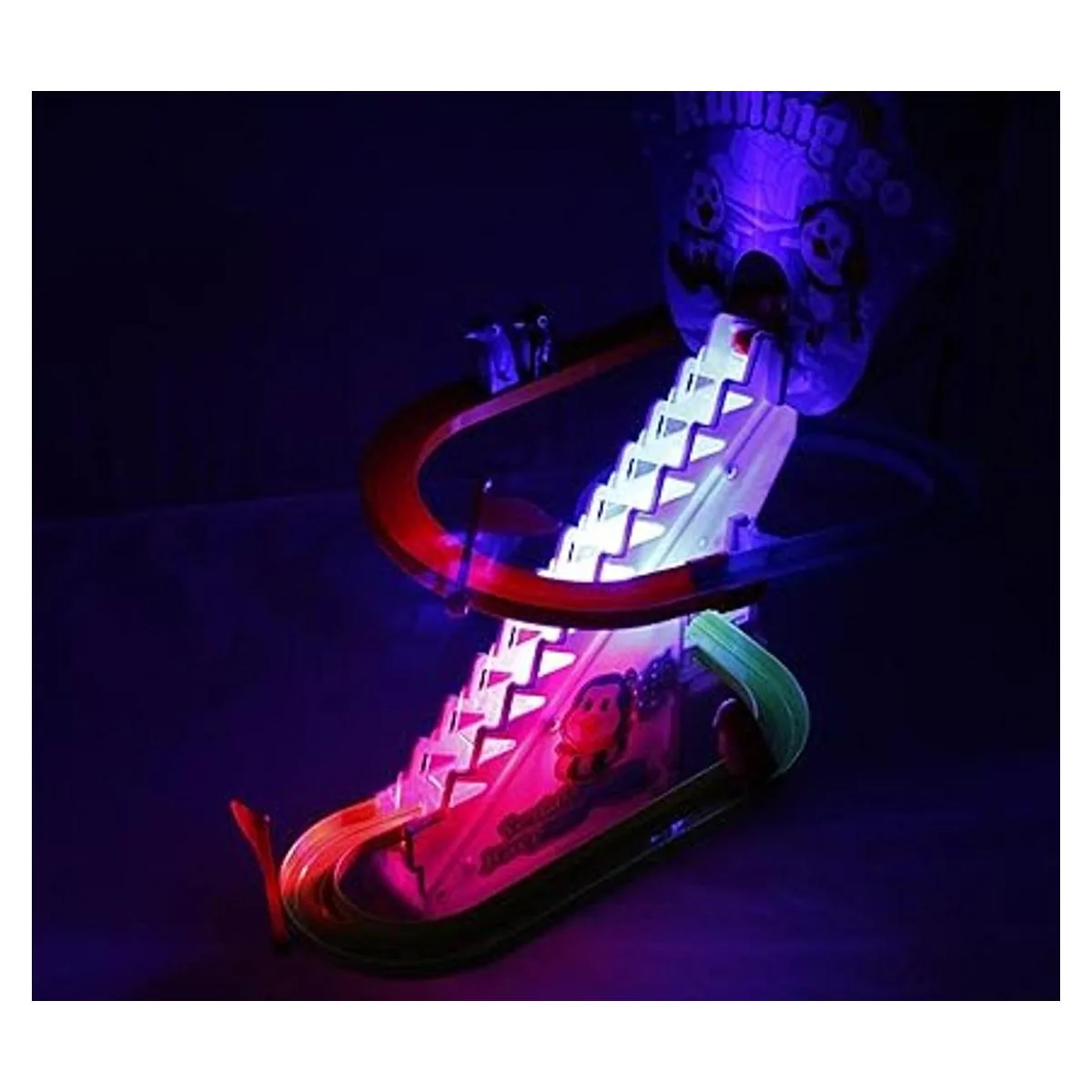 Con luces LED intermitentes. Fácil montaje, bonitos pinginos, pista divertida y música alegre