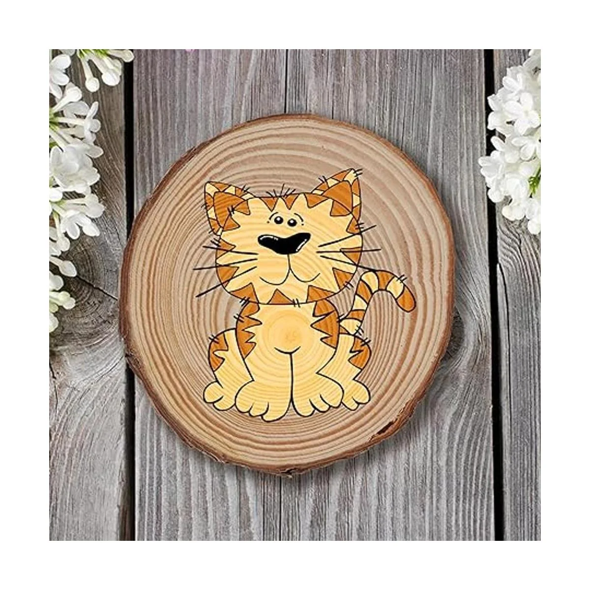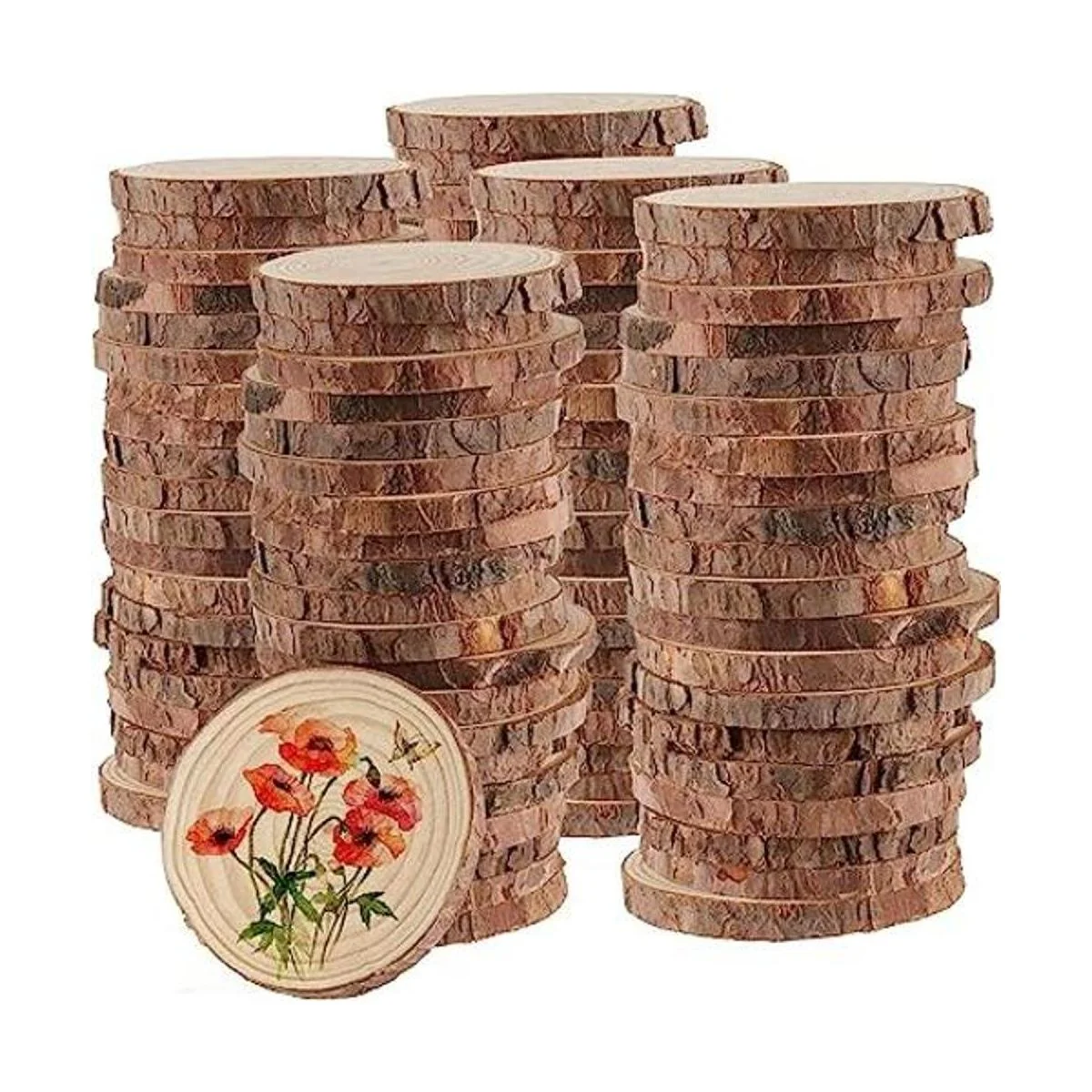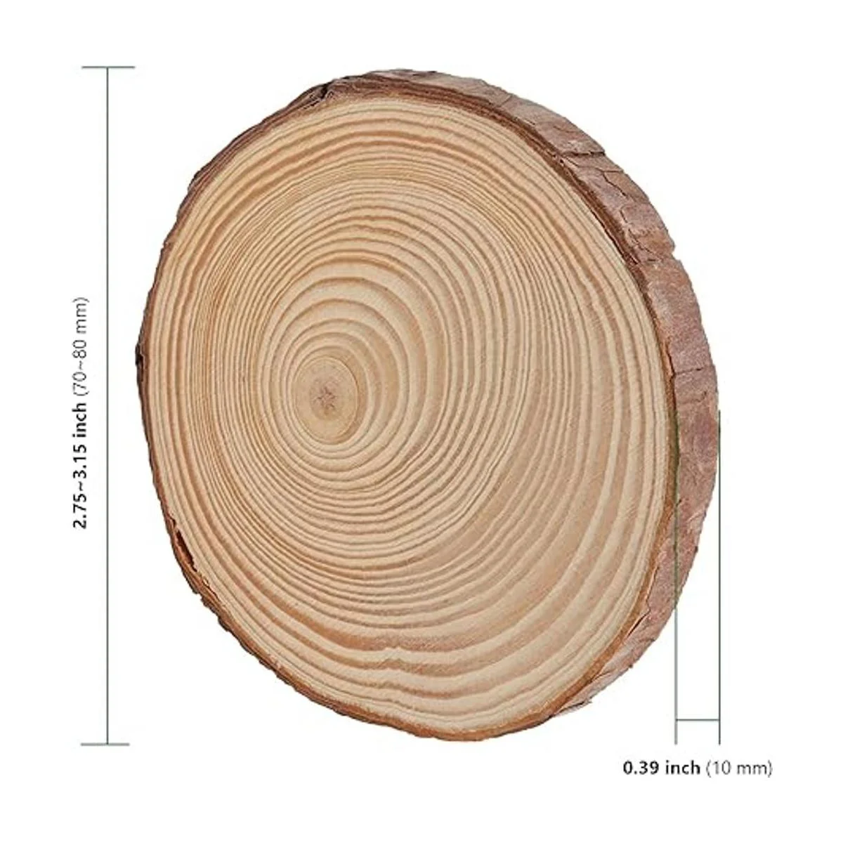 Discos de madera sin acabado de alta calidad: los discos de madera sin terminar están hechos de madera de pino natural de alta calidad directamente cortada y secada y pulida. Conserva su textura original y corteza natural en el borde, que es fuerte y duradero, y no es fácil de romper.
