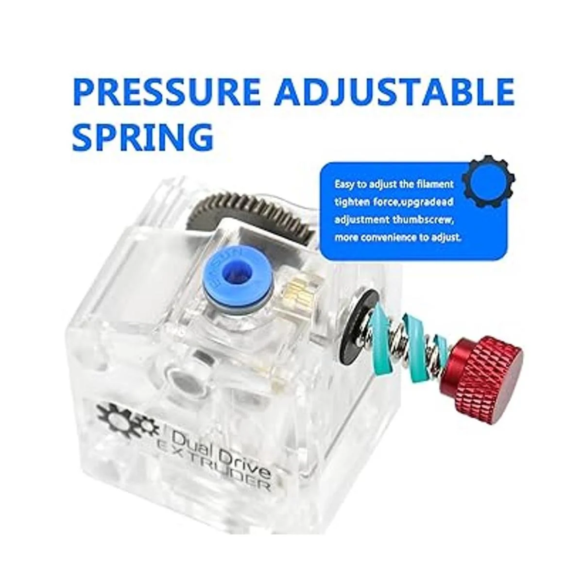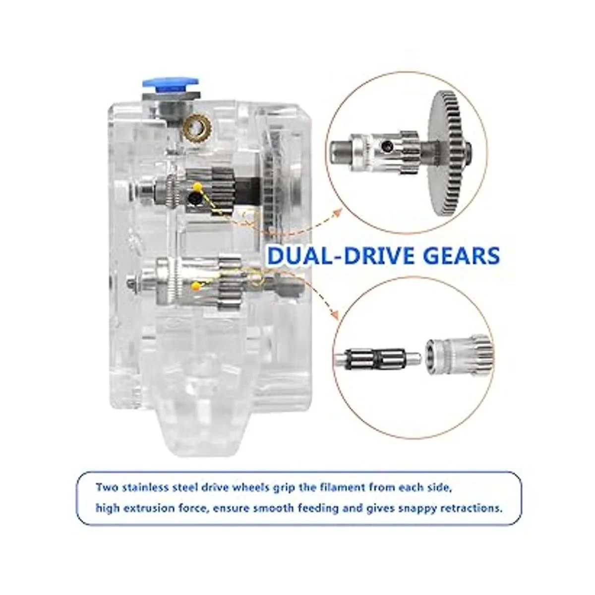 2. Extrusión de doble engranaje: dos ruedas de acero inoxidable agarran el filamento desde ambos lados, alta fuerza de extrusión, garantizan una alimentación suave y proporcionan una retracción rápida, después de muchas mejoras de prueba y error, mejoramos con éxito el problema de mordida del engranaje, mejoramos la durabilidad y fiabilidad de los engranajes reducen el consumo de nuestros engranajes y prolongamos su vida útil.