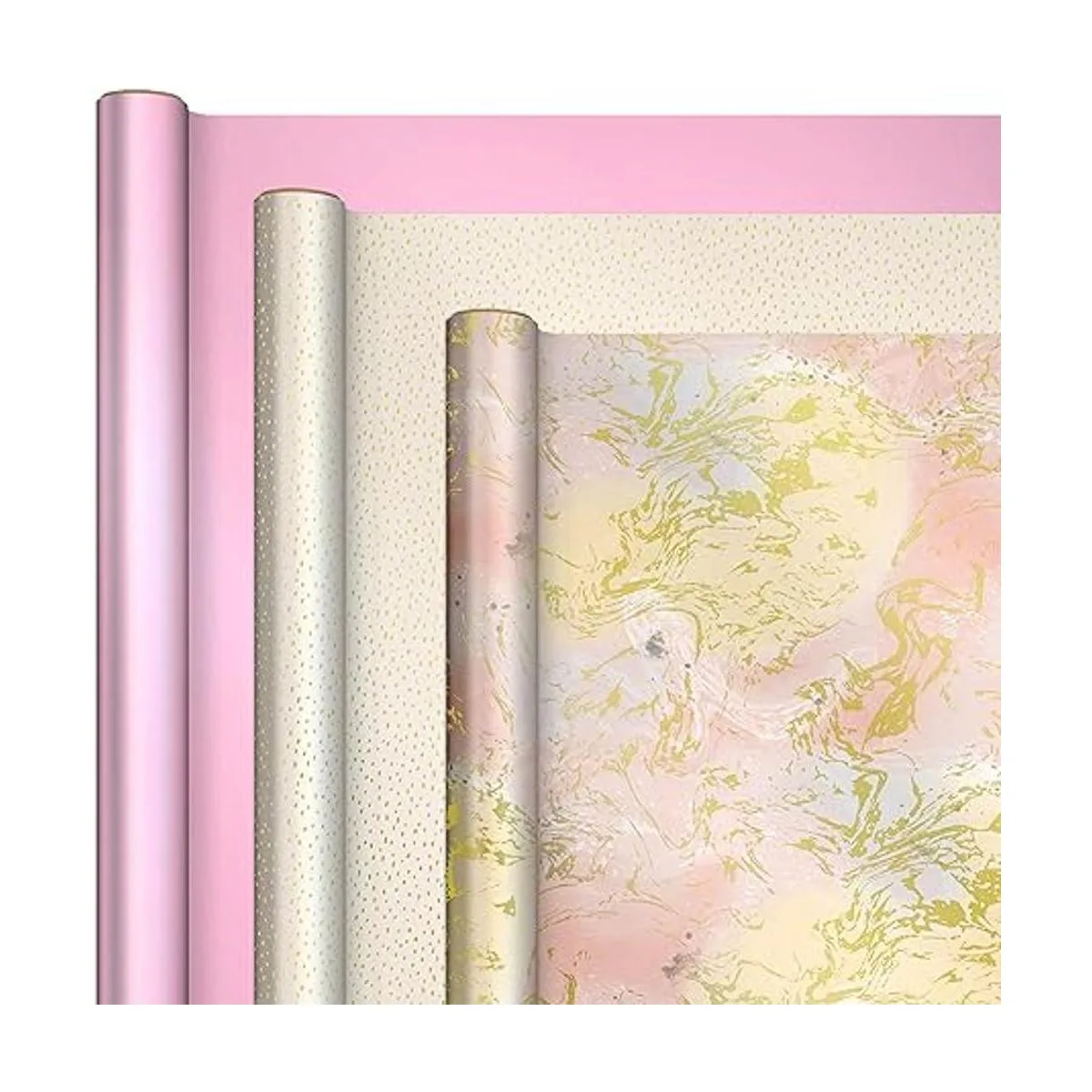 Tres hermosos diseños: el paquete de papel de regalo femenino cuenta con hermosos diseños rosa y dorado: mármol rosa y melocotón, puntos dorados dispersos, rosa sólido