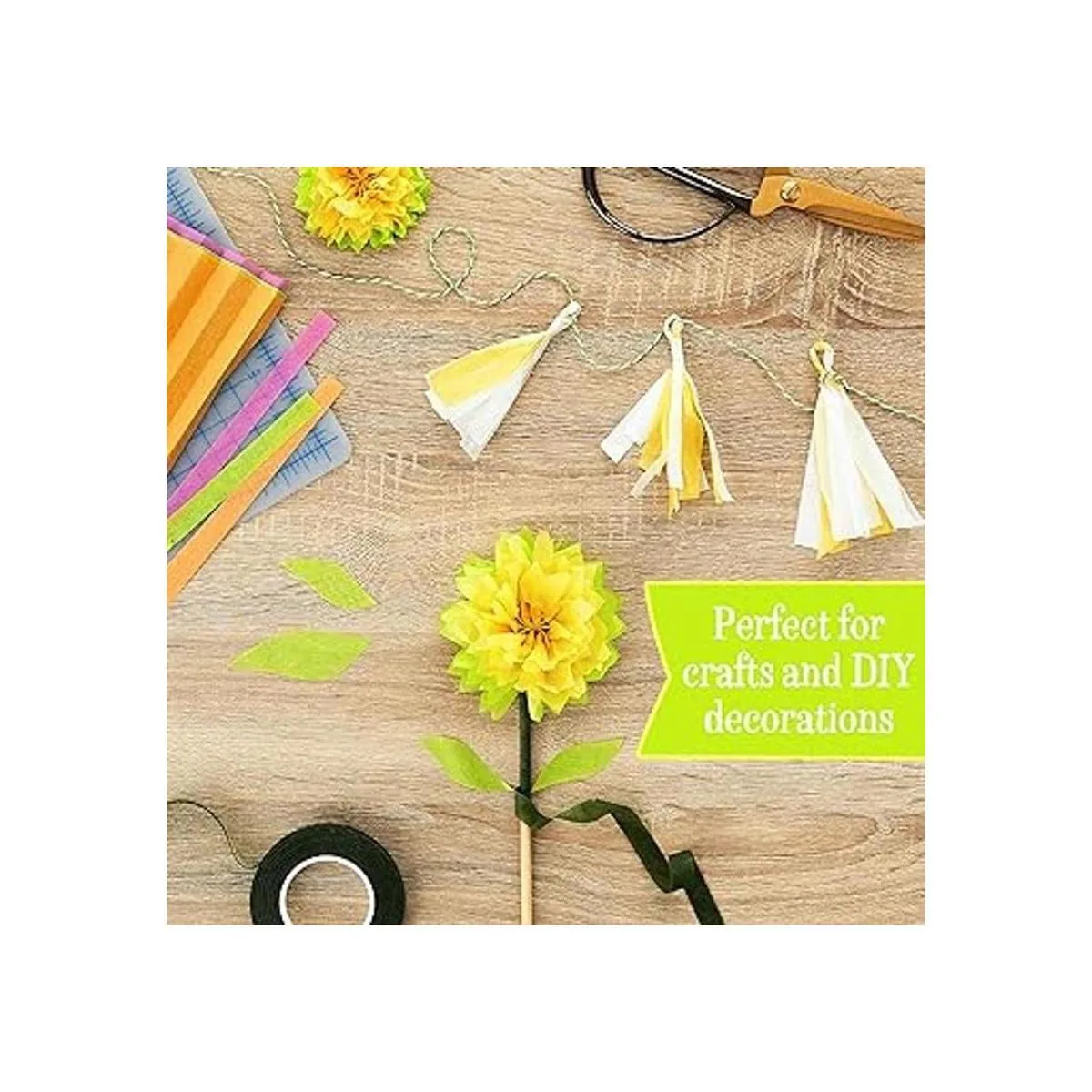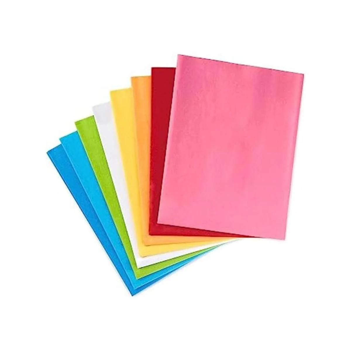 Cada hoja de papel de seda mide 20 pulgadas de largo x 20 pulgadas de ancho. La compra incluye 120 hojas 15 hojas de cada una de rosa fuerte, rojo, naranja, amarillo, blanco, verde, turquesa y azul.