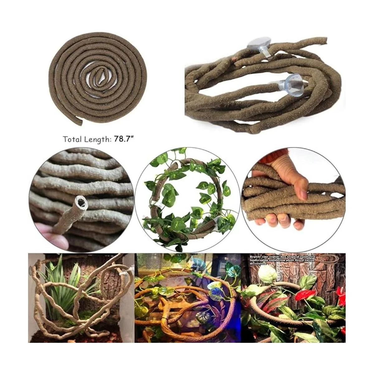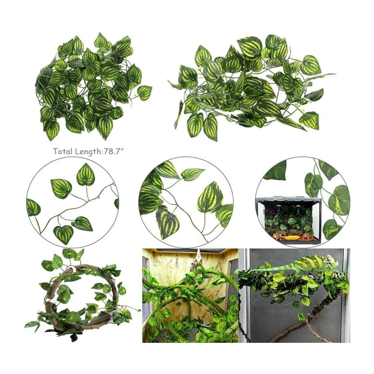 Vides de jungla flexible: enredadera artificial de ratán flexible con tacto y apariencia natural; las vides de jungla para reptiles son a prueba de agua, da a tu mascota una mejor experiencia. Las hojas artificiales están laminadas de polipropileno, con aspecto realista y no se decoloran ni destiñen fácilmente. Proporcionan un hábitat maravilloso y cómodo, diseños simples y formas variadas, hacen que tu barba se sienta como en casa.