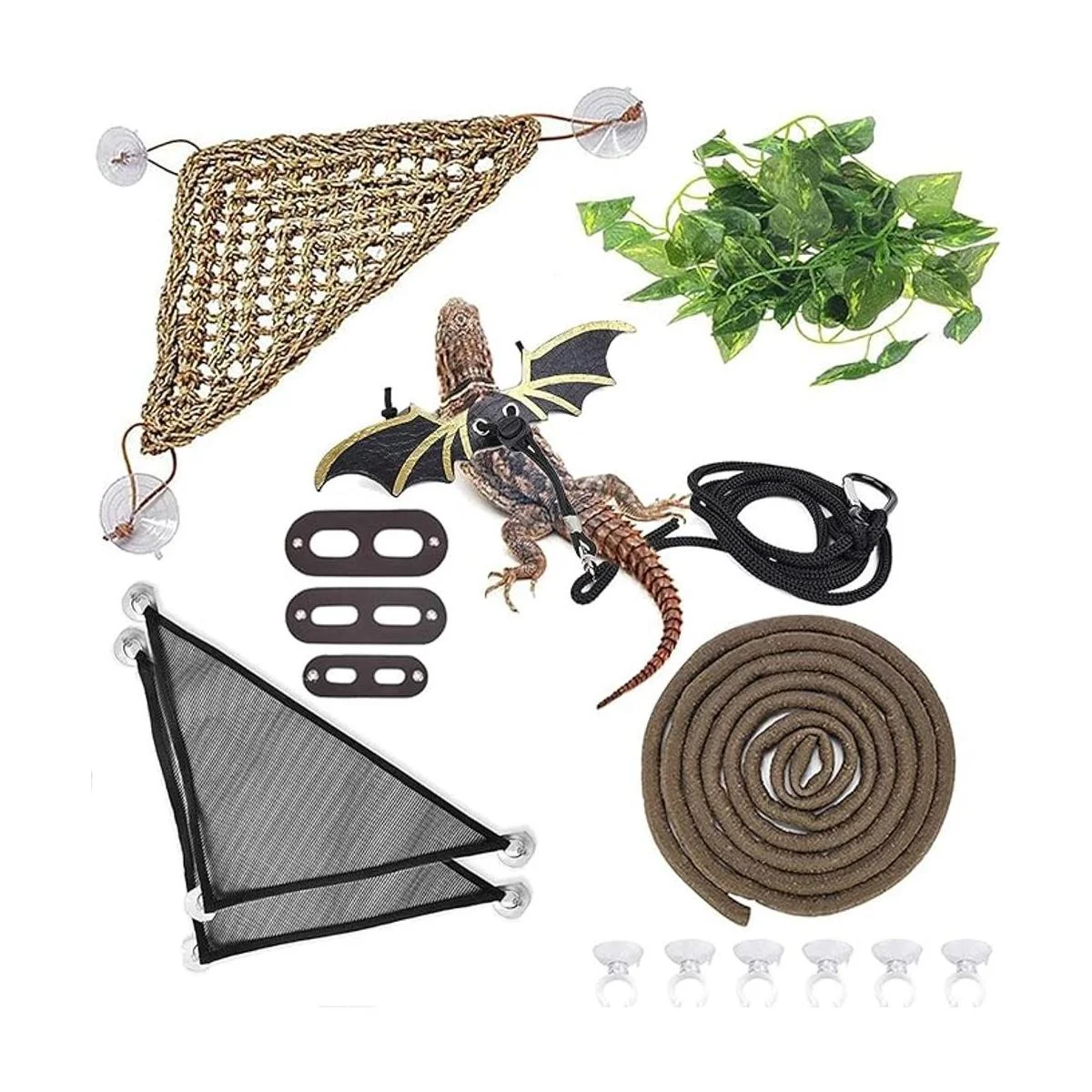 El paquete incluye: 1 hamaca triangular de junco marino con barba de dragón, 1 rama de vid flexible, 1 rama de vid flexible, 2 hamacas triangulares de nailon con barba, 1 cuerda de lagarto, 9 ventosas. Perfecto para reptiles arboreales y anfibios. Adecuado para dragones barbudos, lagartos, camaleones, ranas de árbol, gecos, tortugas, serpientes y otros reptiles.