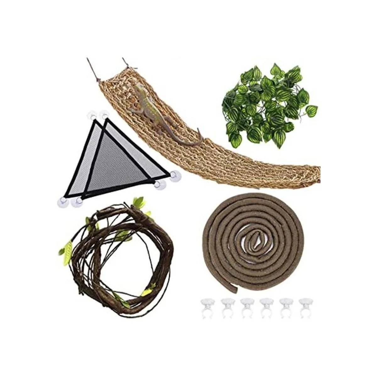 El paquete incluye: 1 hamaca rectangular de dragón barbudo de pasto marino, 2 hamaca triangular de nailon con barba, 1 ramas artificiales de rama de vid flexible, 1 rama de vid flexible, 1 rama de vid flexible, 1 vid flexible con hojas, 10 ventosas y una cuerda de cáñamo. Perfecto para reptiles arbóreos y anfibios. Adecuado para dragones barbudos, lagartos, camaleones, ranas de árboles, geckos, tortugas, tortugas, serpientes y otros reptiles.