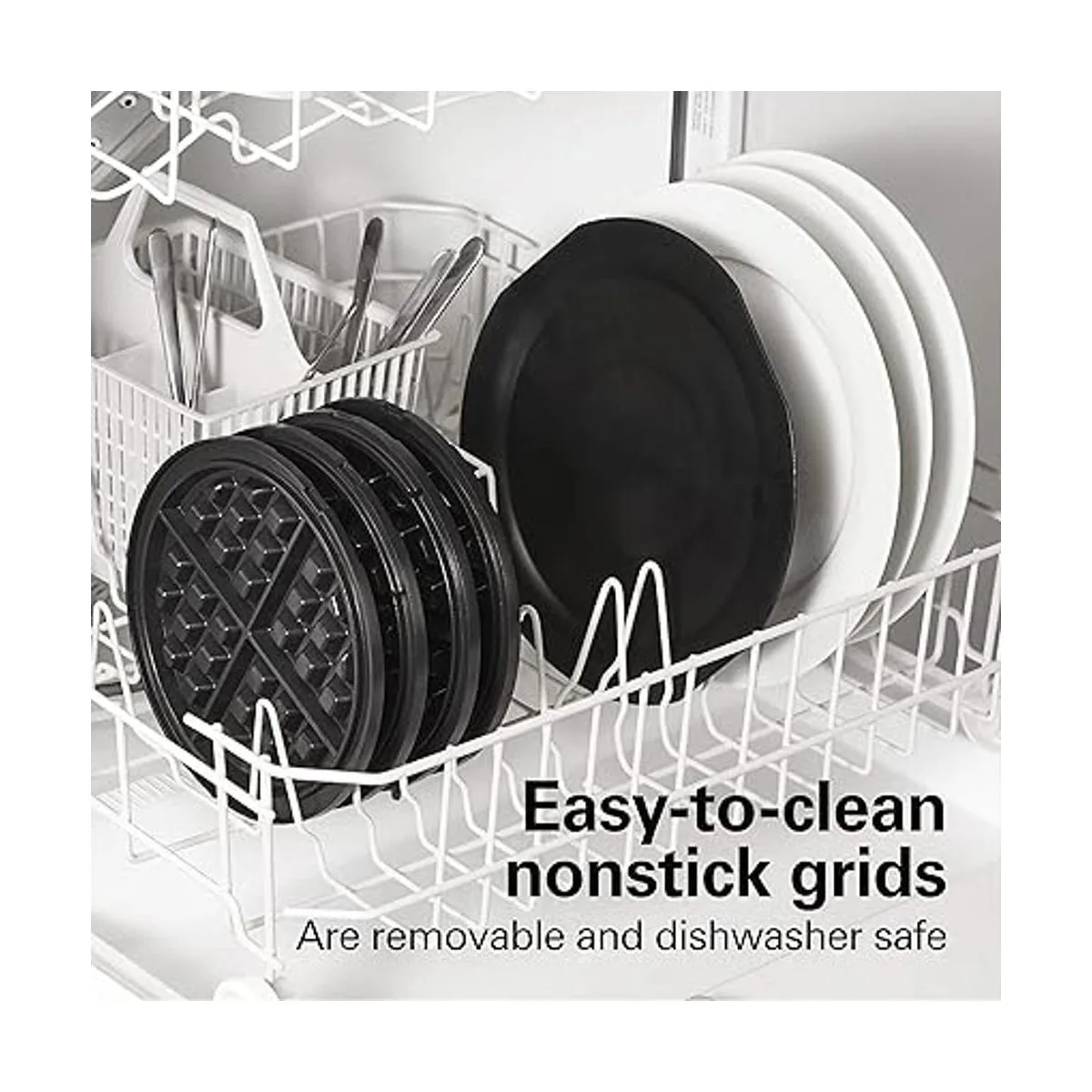 Rejillas antiadherentes fáciles de limpiar. La waflera antiadherente tiene rejillas que se quitan para una fácil limpieza a mano o en el lavavajillas.