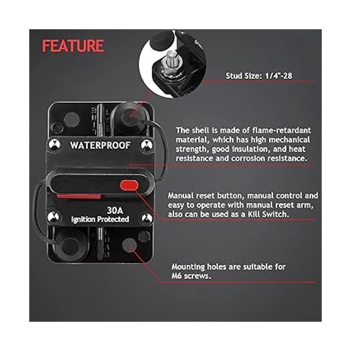 Hamolar Paquete de 3 fusibles de interruptor de audio estéreo para automóvil de 30 amperios de 1248 V CC de botón de reinicio manual, con tacos de alambre, arandela de cobre