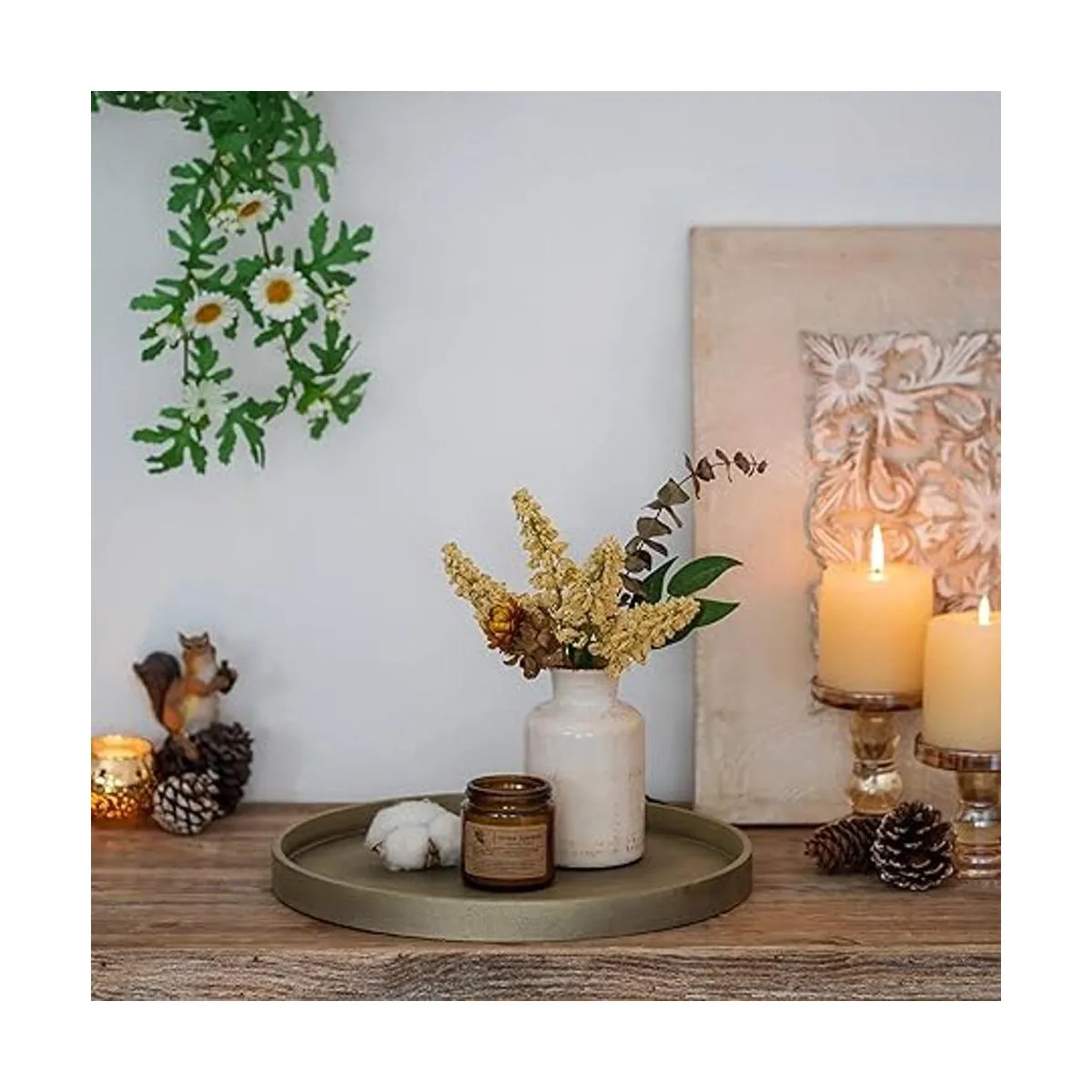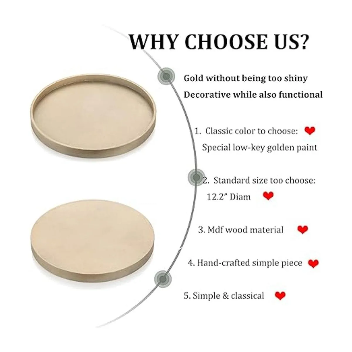 Material de madera: la bandeja circular simple pero rústica está hecha de madera MDF, peso ligero pero resistente, es una opción perfecta para exhibir y servir. La madera duradera tiene más textura que el plástico y puede resaltar fácilmente un estilo natural que complementa perfectamente tu decoración vintage o elegante.