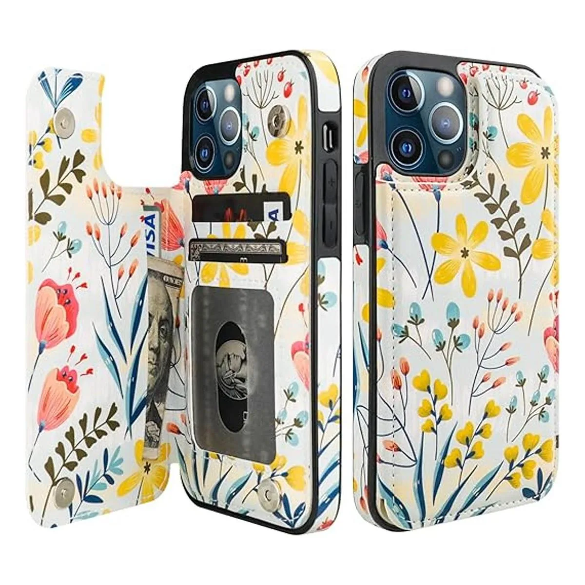 HAOPINSH Funda tipo cartera para iPhone 1212 Pro con soporte para tarjetas, diseño de flores florales en la parte trasera, funda de cuero sintético con ranuras para tarjetas para mujeres y niñas, doble cierre magnético a prueba de golpes, 6.1 pulgadas