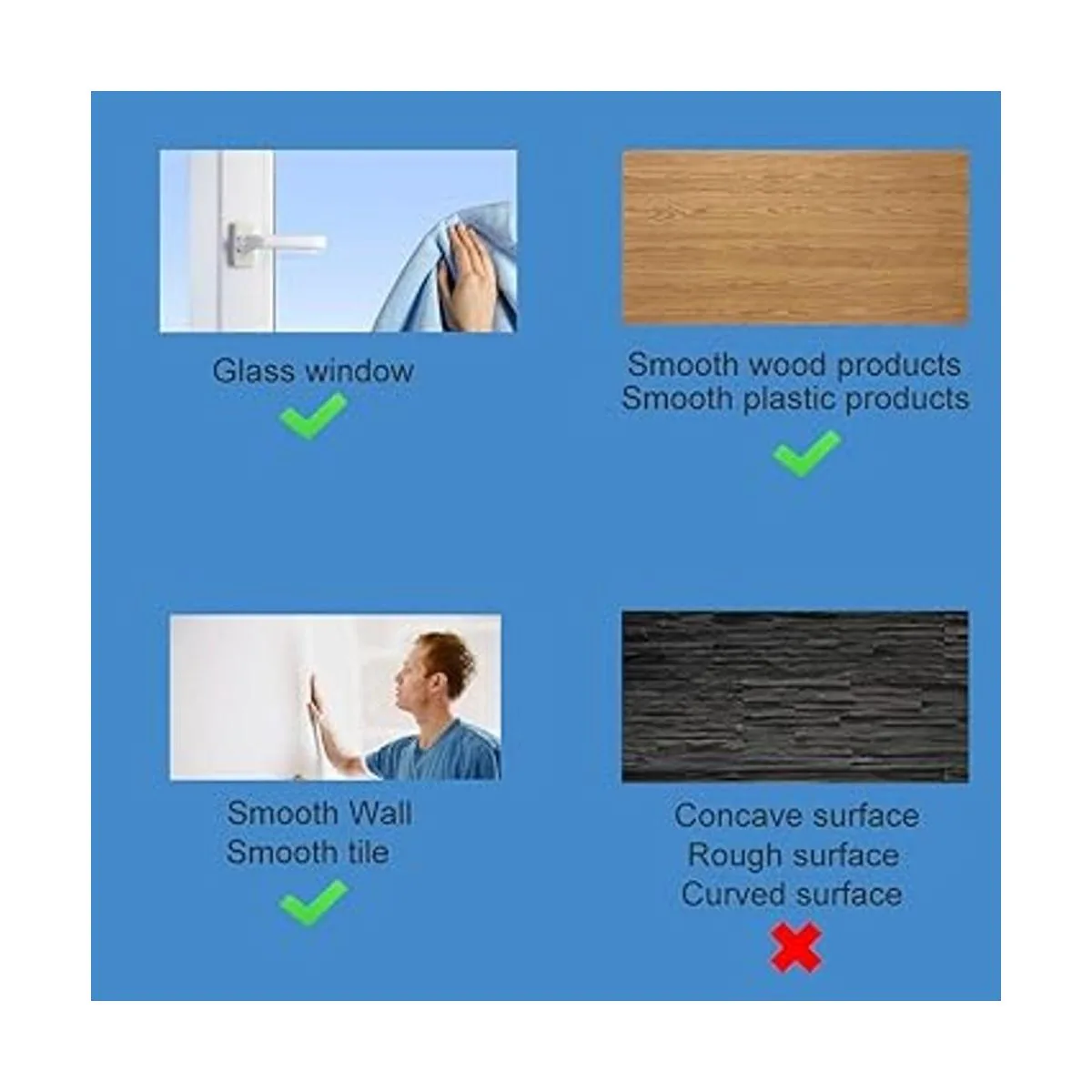 Limpia la zona que necesita pegarse con un paño adecuado para pegar a paredes lisas/productos de plástico lisos/vidrio liso/azulejos lisos/productos de madera lisa y otros objetos de contacto suave. No apto para superficies irregulares, rugosas y curvas. Asegúrate de que la superficie de contacto del adhesivo se limpia y seca a fondo antes de aplicar el nuevo adhesivo.
