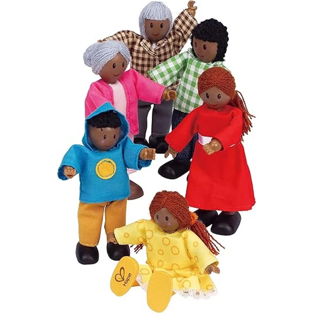 Hape familia afroamericana muñecas de mandera, miembros de familia.