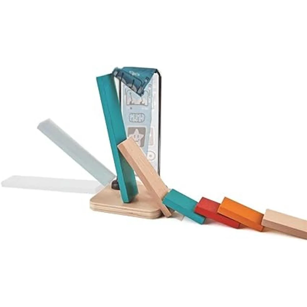 Mira el efecto dominó: el impulso se lleva a través del curso por la rueda de impulso, dominó y la bola de madera. Cuando la bola llega al final, una bandera de acabado se despliega para un final dramático a medida que tu último dominó cae.