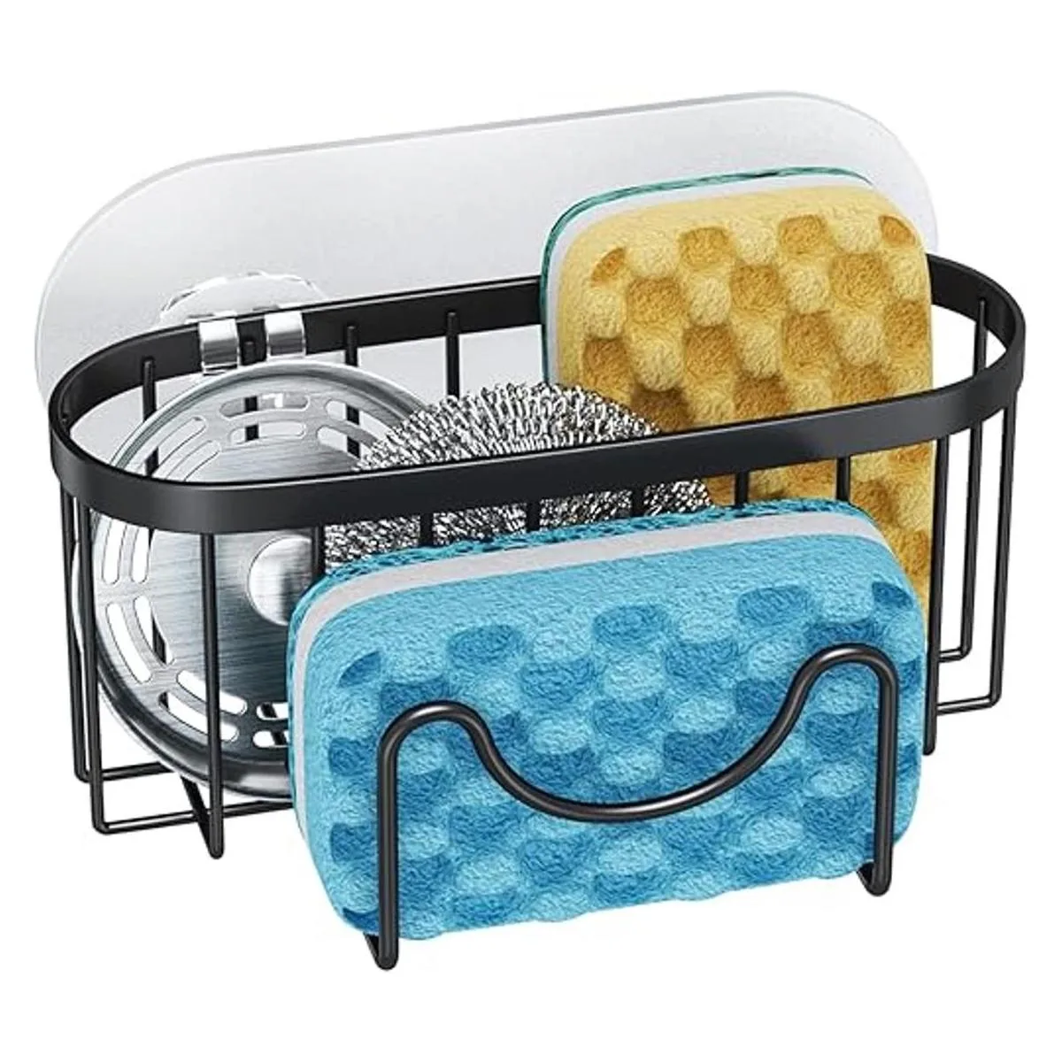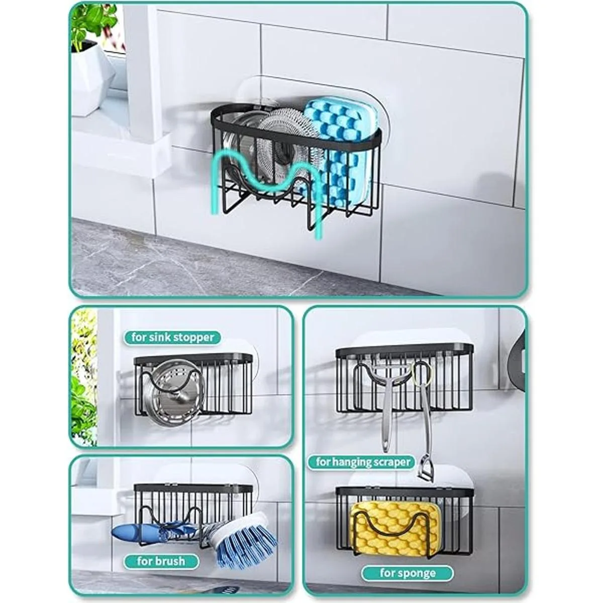 HapiRm Soporte de esponja multifuncional con forma de M, organizador único de fregadero de cocina, organizador de fregadero de acero inoxidable a prueba de óxido para esponja, cepillo, tapón de fregadero y raspador, color negro