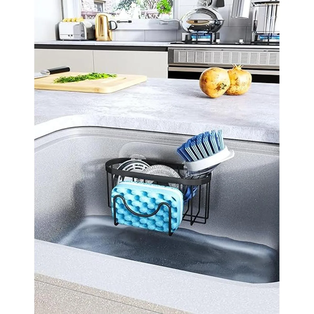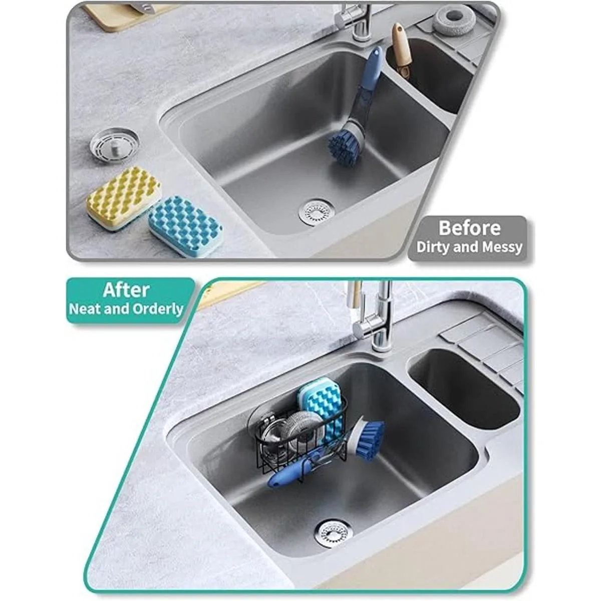 Máscara Estás cansado de los accesorios de cocina dispersos por todas partes El organizador de fregadero Hapirm está especialmente diseñado para limpiar accesorios en la cocina. La barra transversal única en forma de M de nuestro soporte de esponja de cocina no solo puede colocar esponja, tapón de fregadero y cepillo, sino también colgar raspadores y otros artículos que son difíciles de almacenar. El marco cóncavo en el medio es más conveniente para llevar cosas, puede ahorrar tiempo de encontrar y te permite tener más tiempo para acompañar a tu familia.