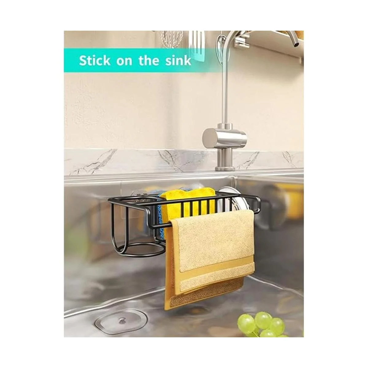 HapiRm SUS304 Soporte para esponja adhesiva 4 en 1, soporte para cepillo de acero inoxidable + colgador de tela para platos + jabonera + soporte para tapón de fregadero con 2 formas de instalación, sin perforación, negro