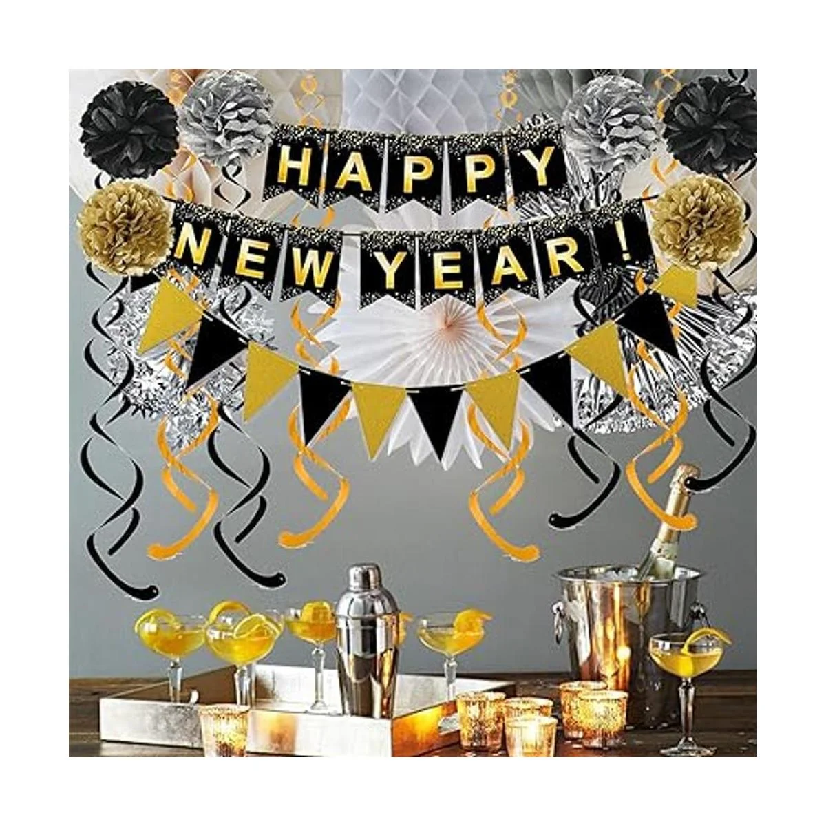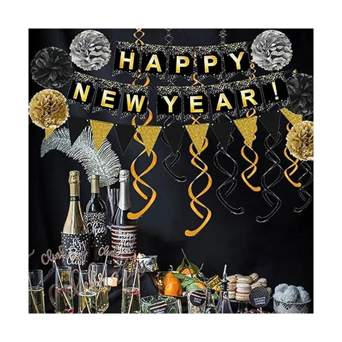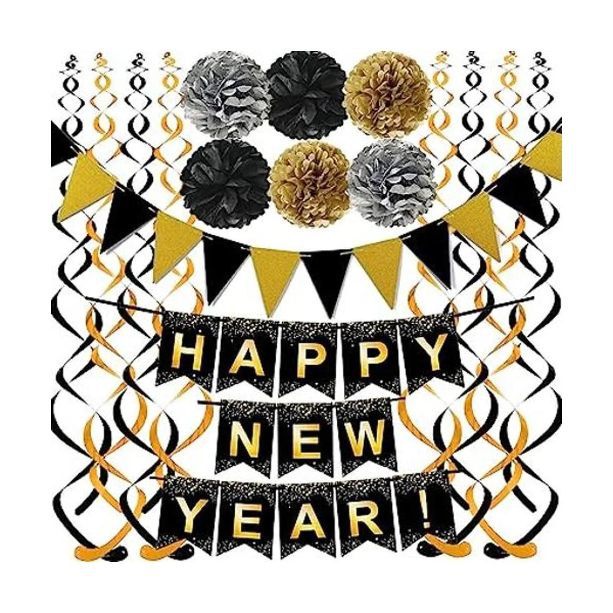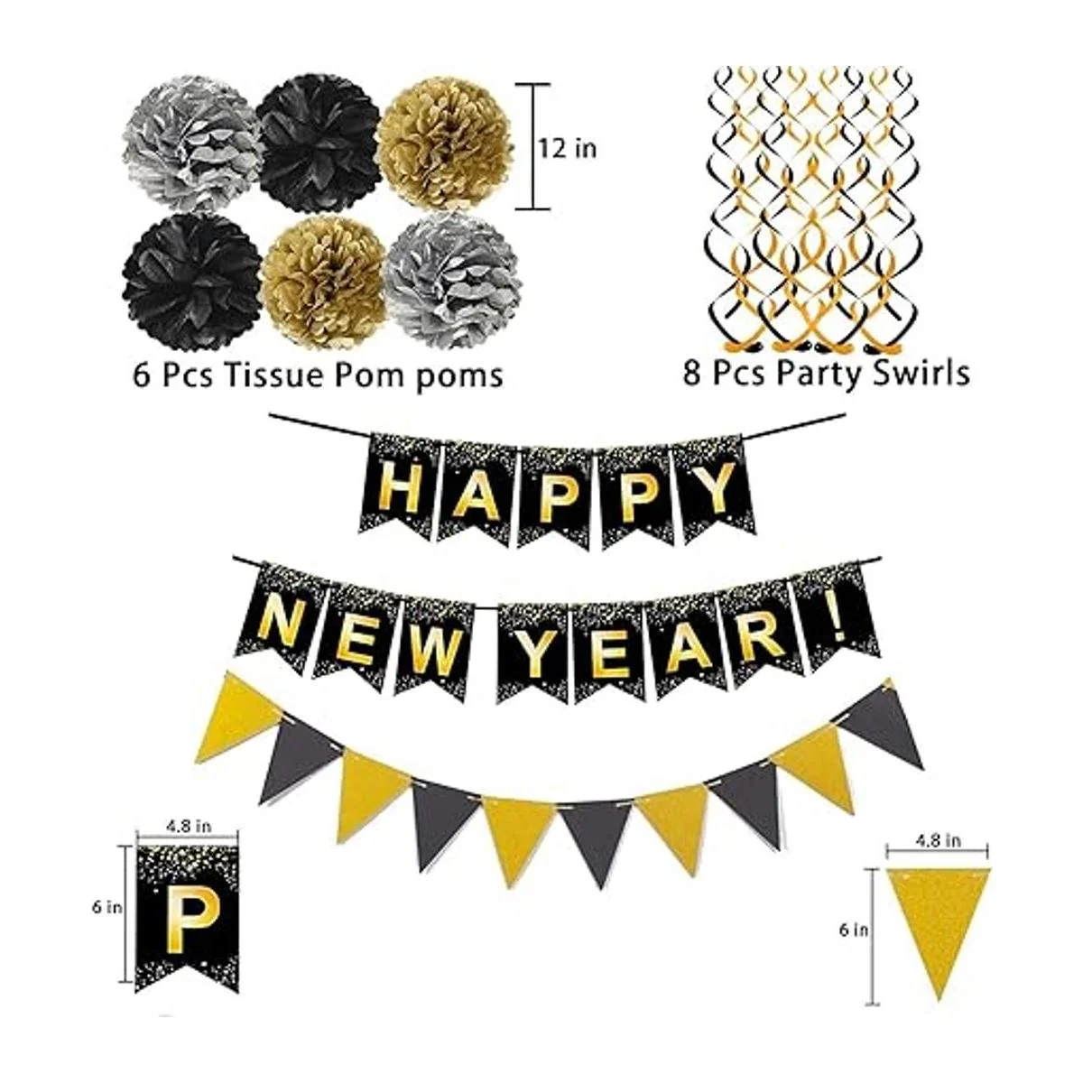 Color: La pancarta de Feliz Año Nuevo 2022 es negro y dorado; la bola de pompones es negro, dorado y gris; la bandera triangular es dorada y negra; la serpentina es dorada negra. Este es un esquema de color clásico atemporal que hace que tu fiesta de año nuevo sea aún más lujosa y atmosférica.