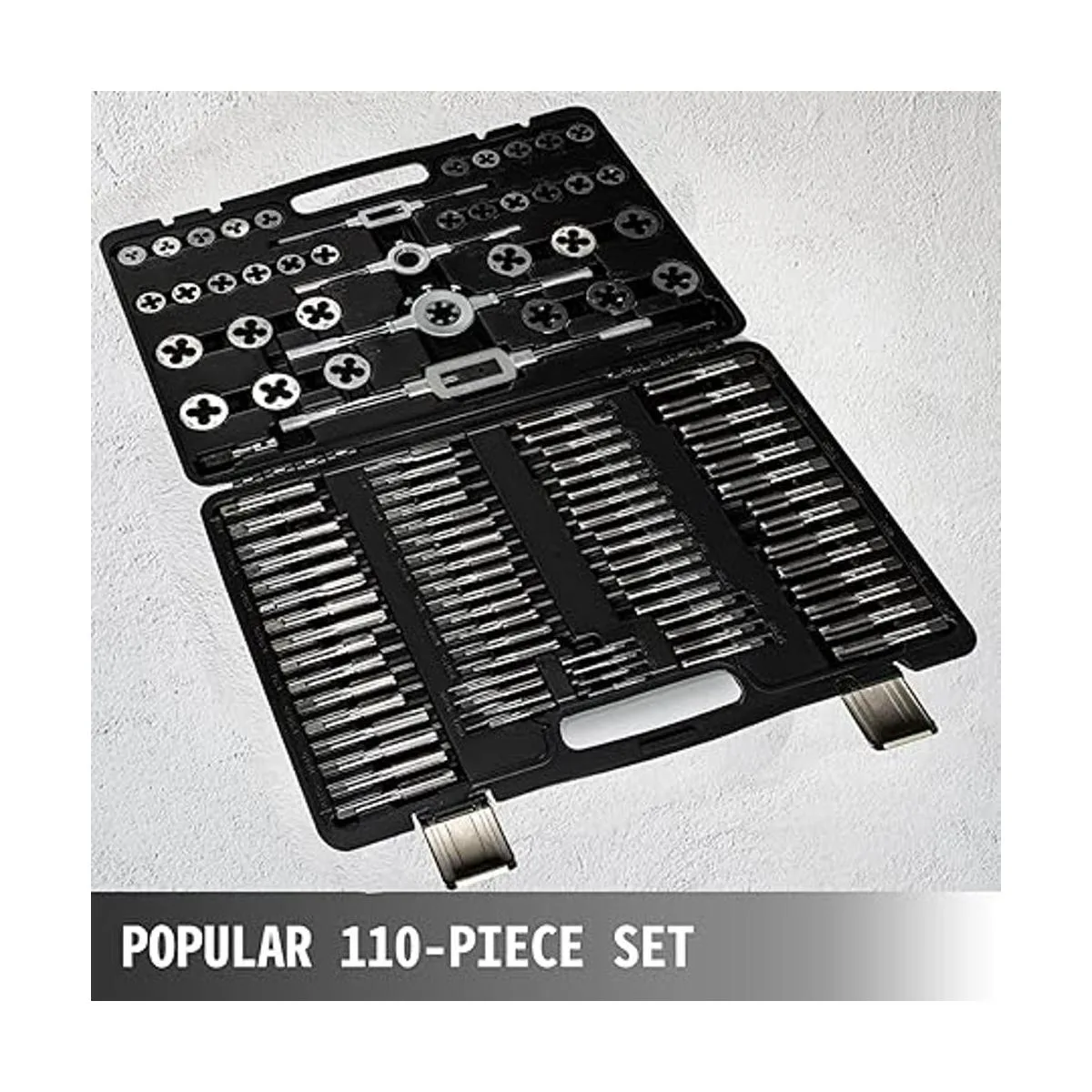 Happybuy Juego de 110 piezas de grifos y troqueles métricos, incluye juego M2M18, juegos de troqueles y grifos de titanio de acero de tungsteno con estuche de almacenamiento, juego de troqueles grandes para cortar hilos externos e internos
