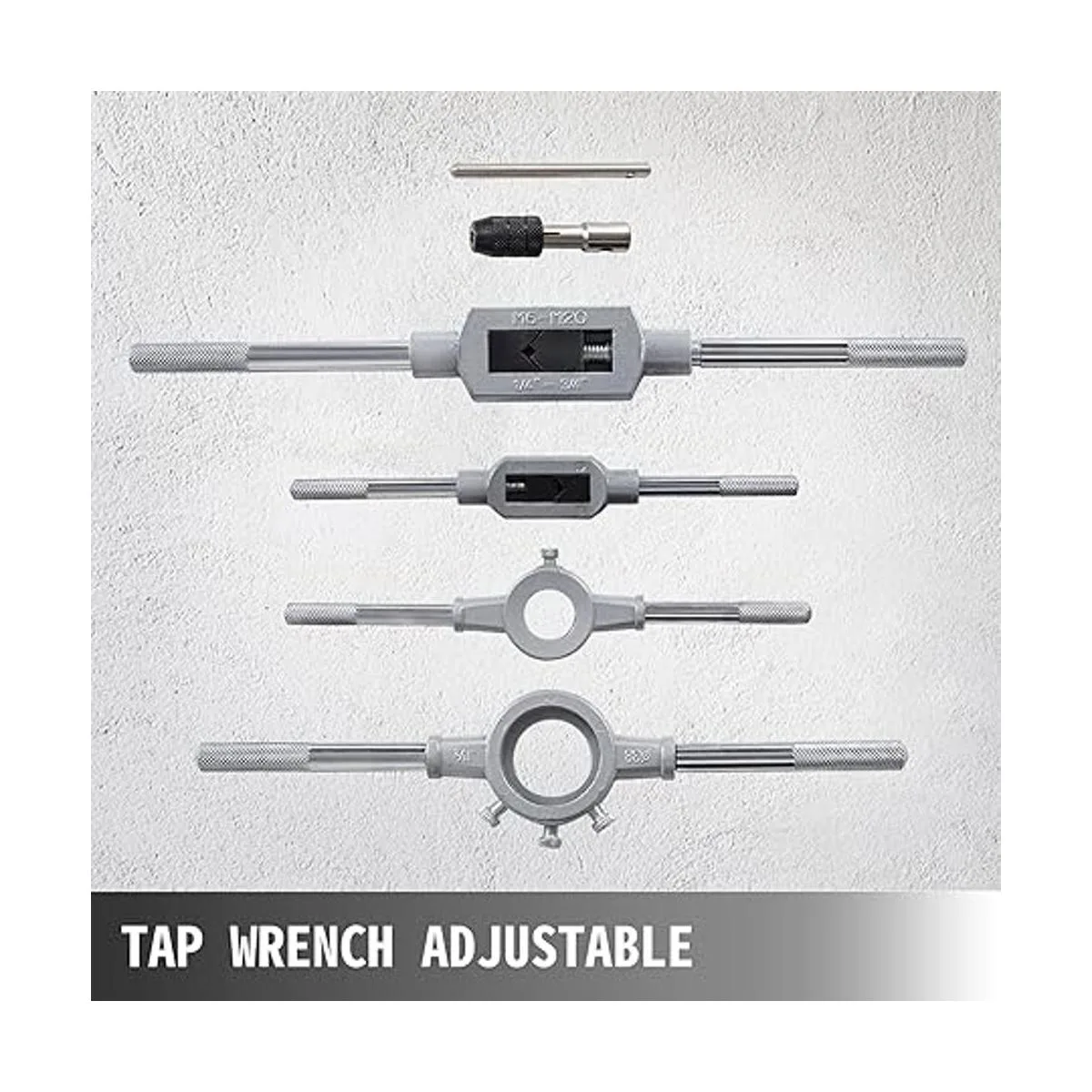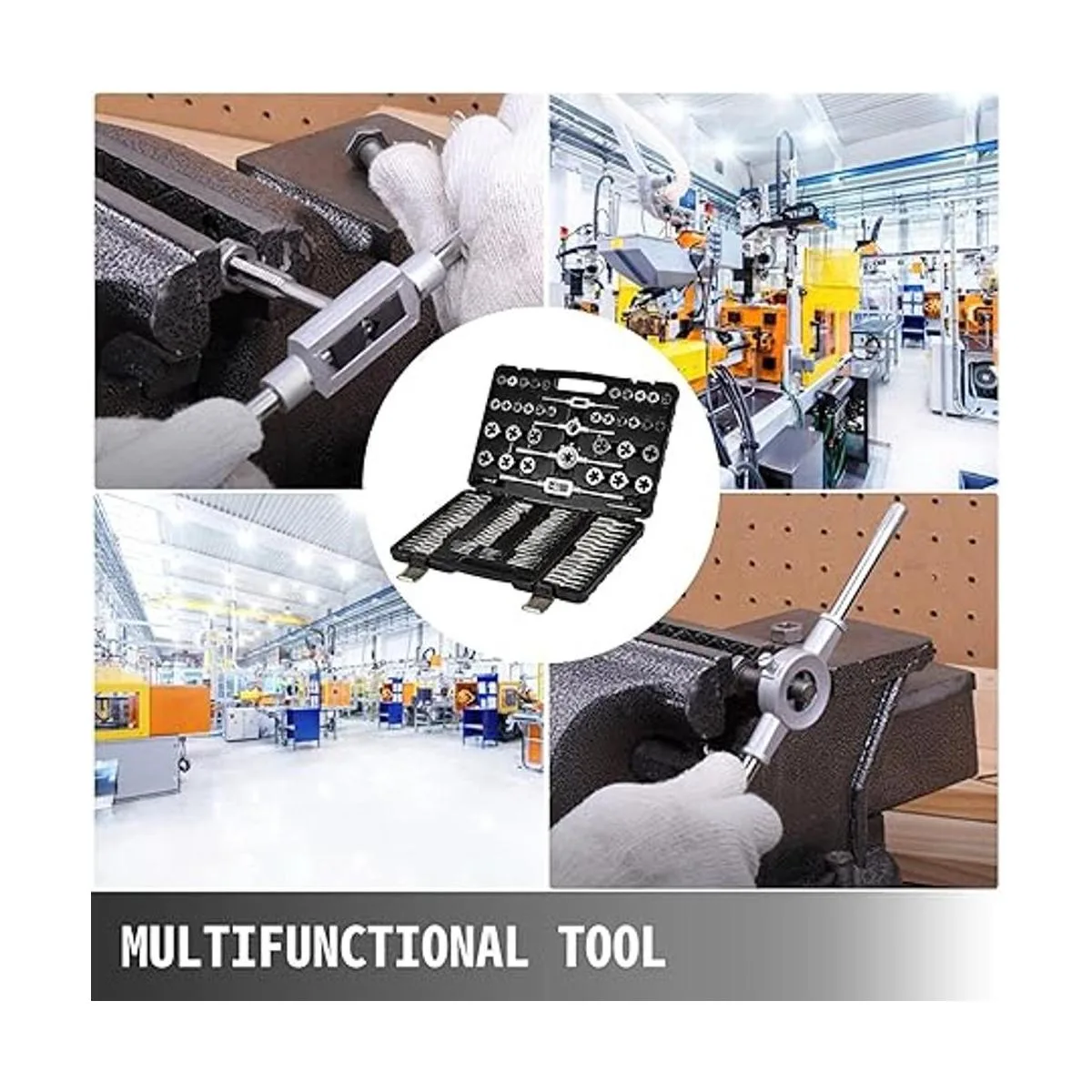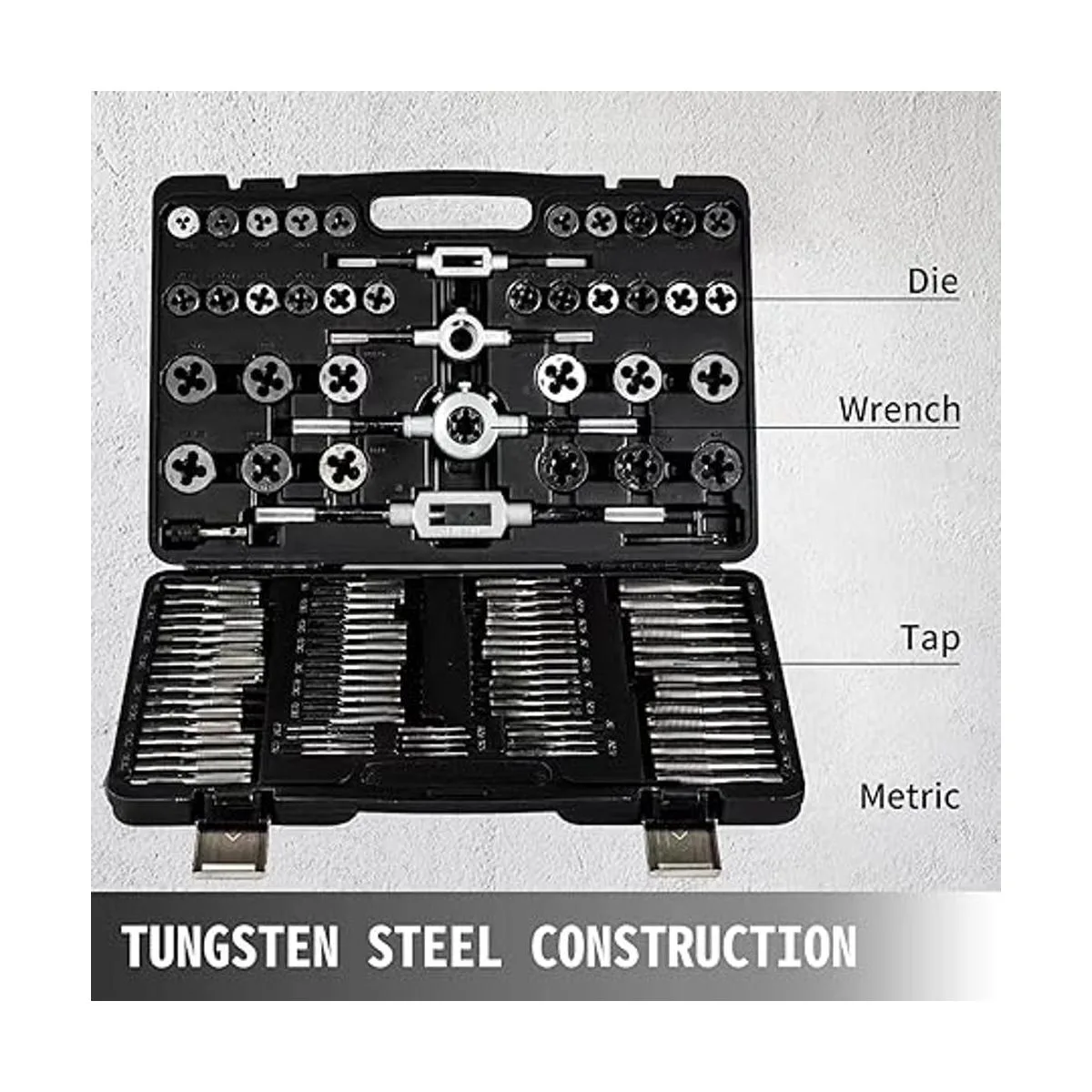 Juego de grifo y troqueles todo en uno: este juego de grifos y troqueles viene con 110 piezas totalmente en una caja de almacenamiento. Este juego de herramientas métricas incluye: 1 35 grifos de enchufe; 2 35 grifos cónicos; 3 35 troqueles; 4 2 soportes de grifo; 5 2 soportes de troquel; 6 1 llave de grifo de barra en T.