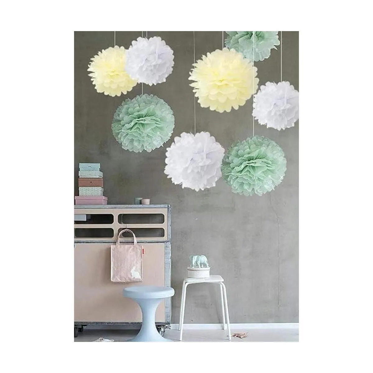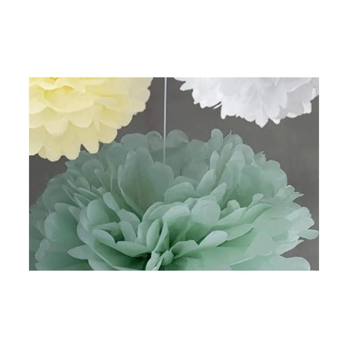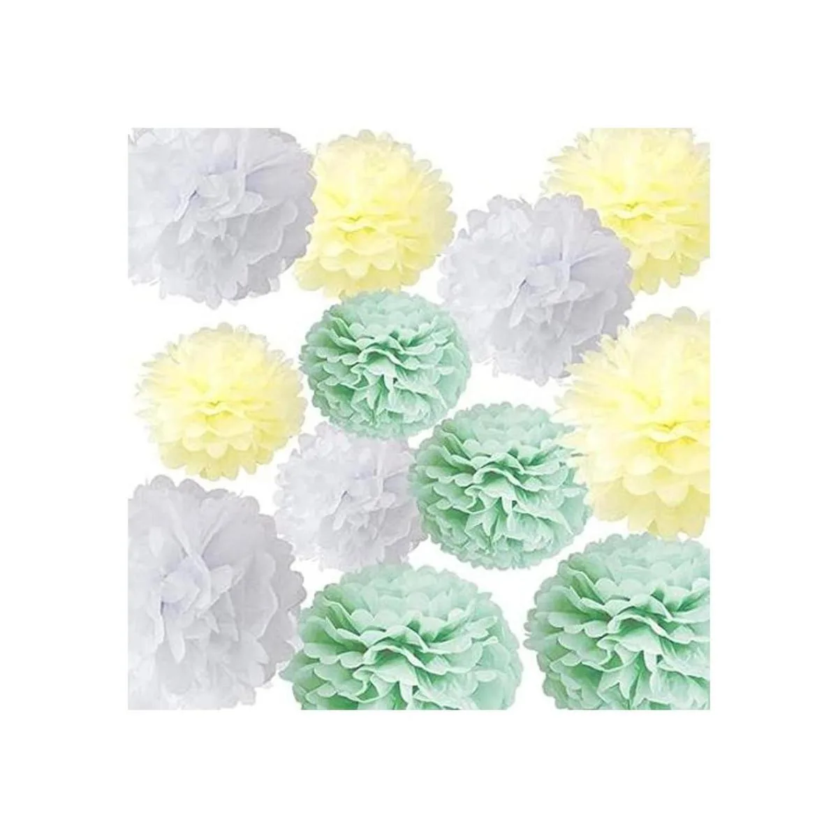Dale un toque especial a tu próxima fiesta con esta bonita combinación de pompones de tejido verde pastel, marfil y blanco. Ahora el paquete de tamaño perfecto para decorar sobre una fiesta o mesa de regalo.