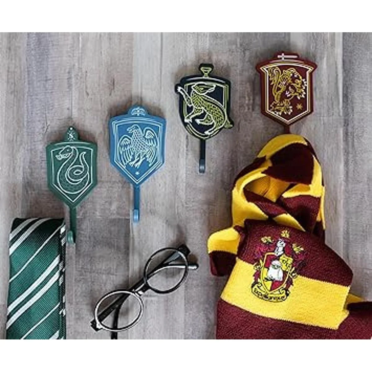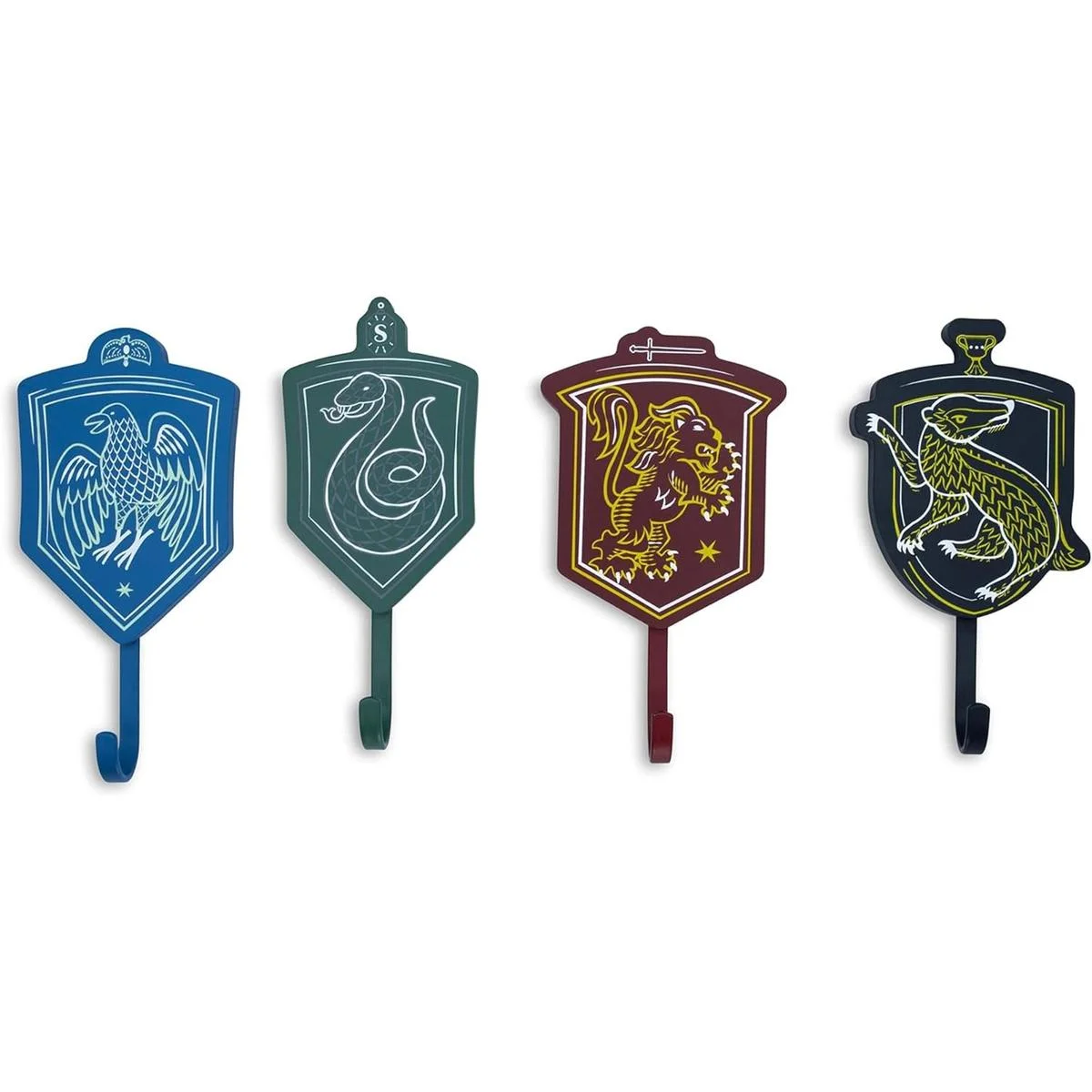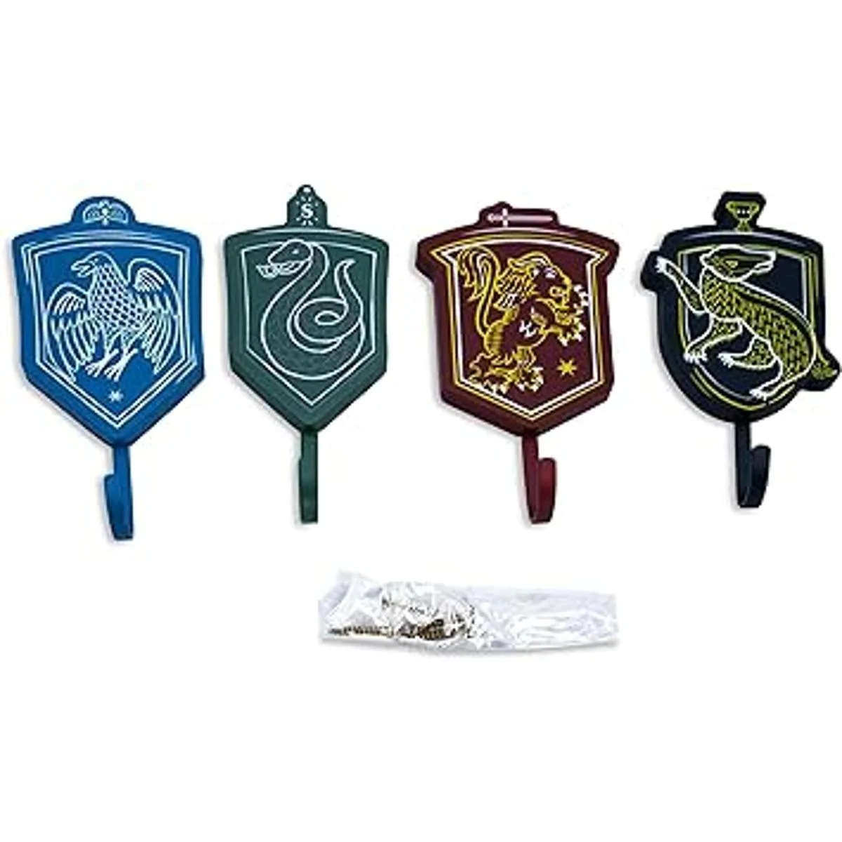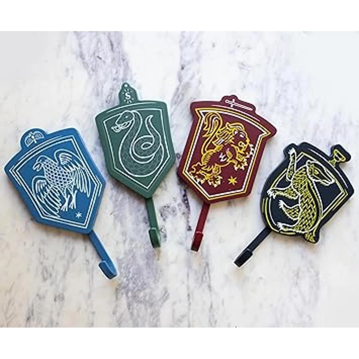 Diseño mágico: estos ganchos decorativos de pared representan Gryffindor, Hufflepuff, Ravenclaw y Slytherin. Cada gancho de pared cuenta con el animal Hogwarts House en el color adecuado: rojo, negro, azul y verde.
