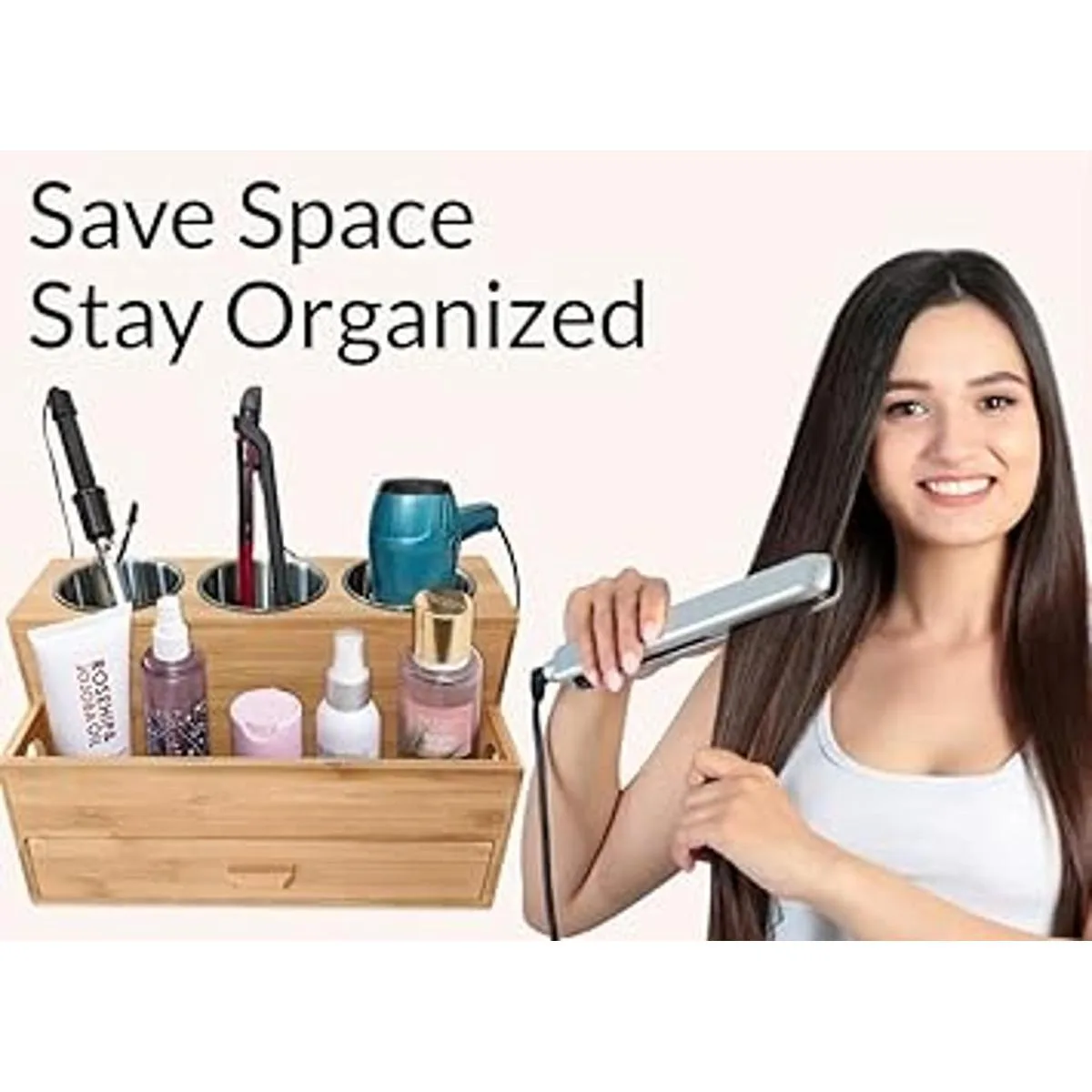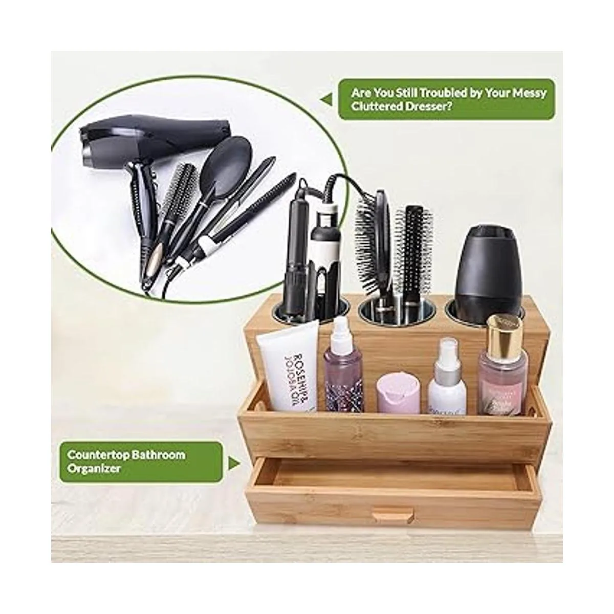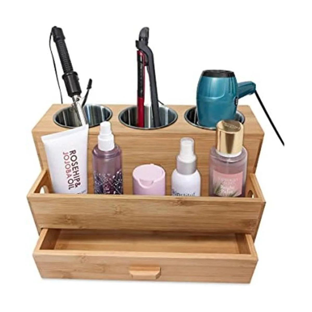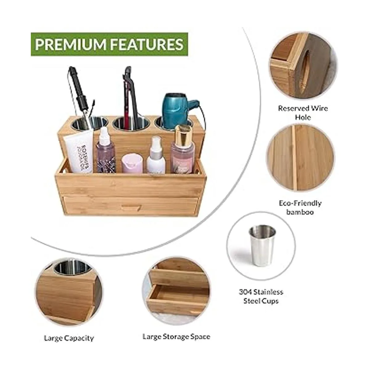 Harzen Brothers Organizador de herramientas para el cabello: bambú, soporte para secadora de aire, encimera de baño, soporte de almacenamiento para accesorios, maquillaje, artículos de tocador