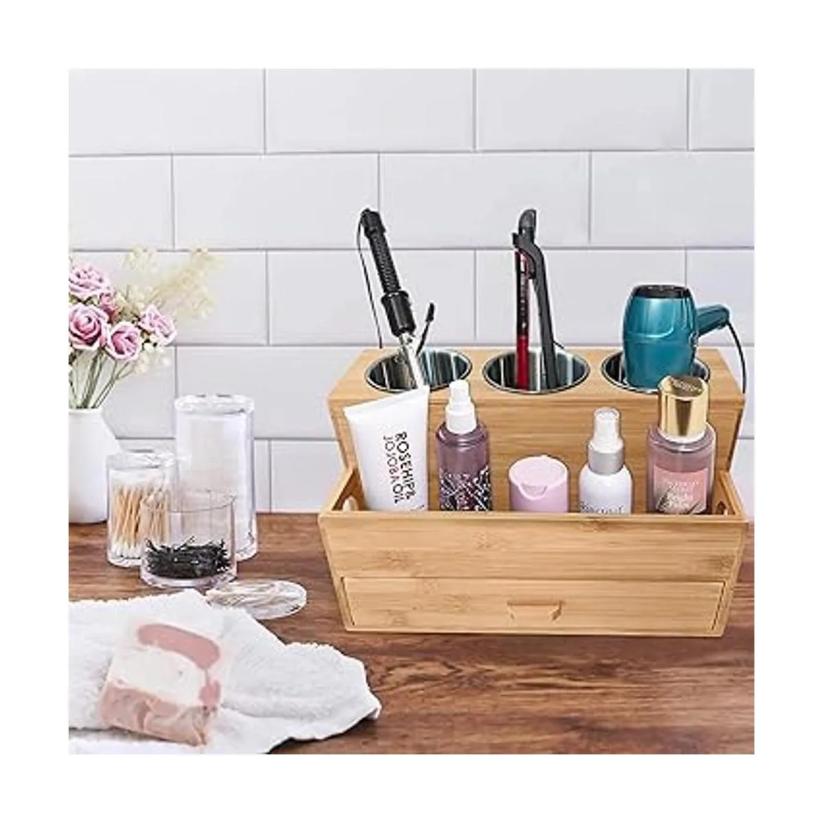 Harzen Brothers Organizador de herramientas para el cabello bambú, soporte para secadora de aire, encimera de baño, soporte de almacenamiento para accesorios, maquillaje, artículos de tocador