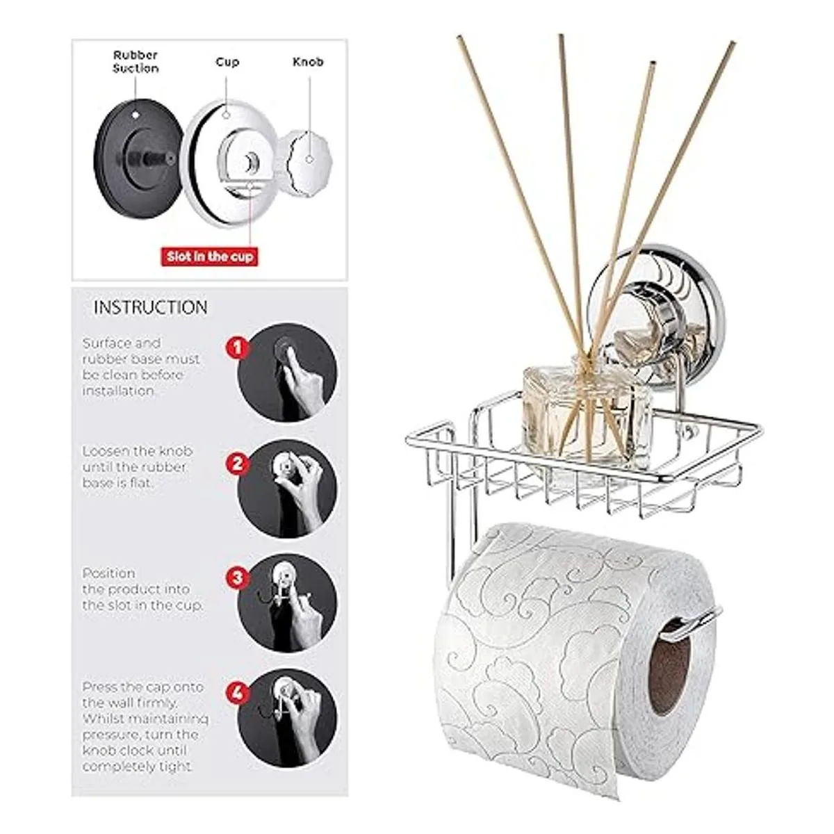 Resistente a la corrosión: el soporte para papel higiénico está hecho de todos los materiales de alta calidad para evitar cualquier oxidación y corrosión. El gancho está hecho de acero inoxidable cromado, la tapa y el pomo están hechos de plástico endurecido cromado y la ventosa está hecha de goma de alta calidad.
