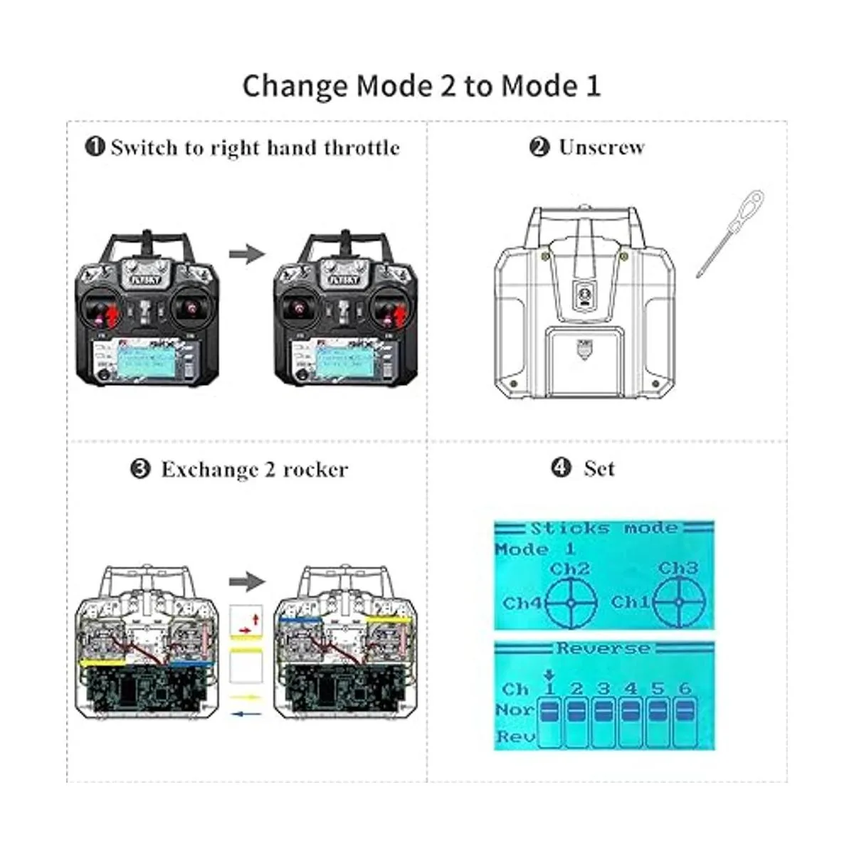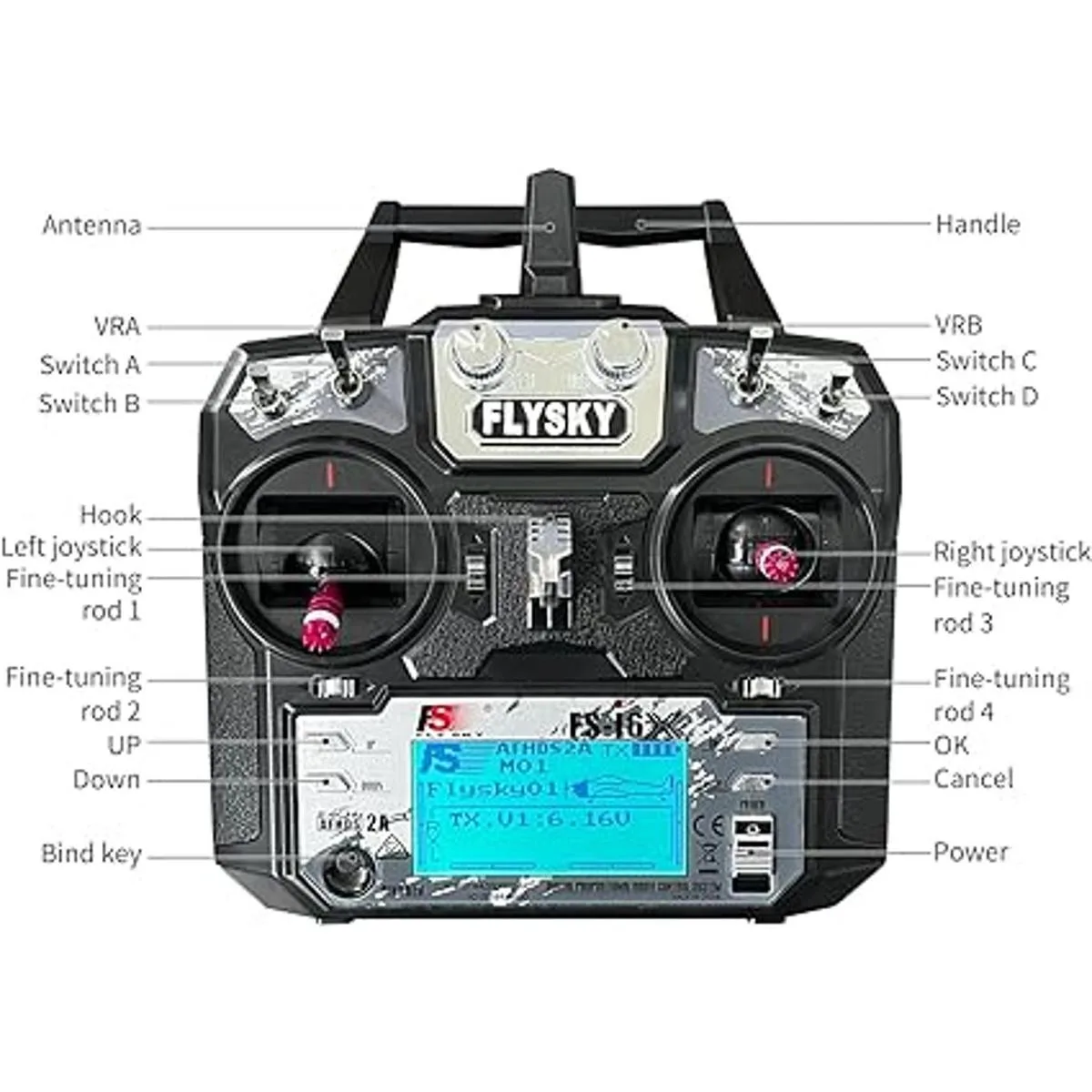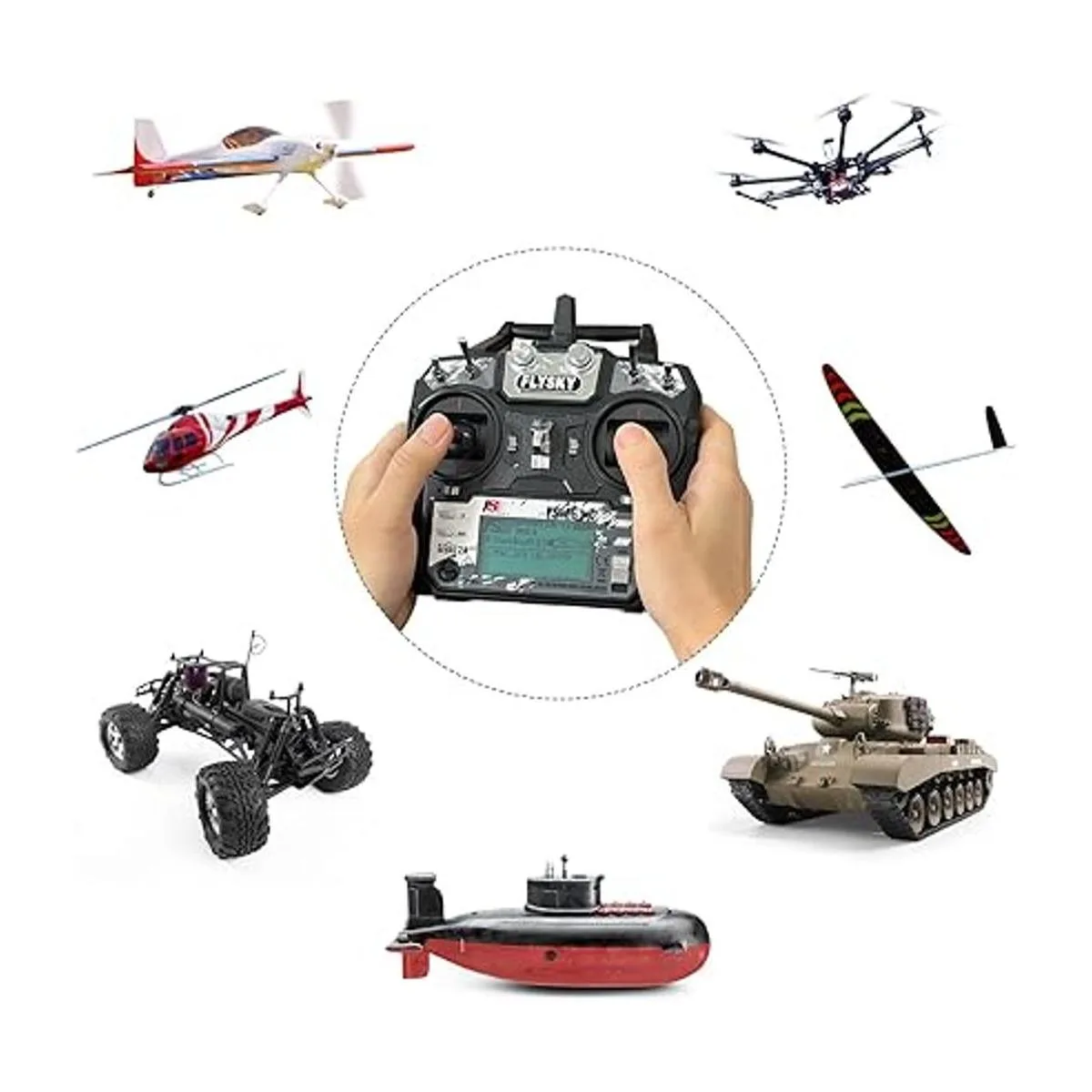 Cubre más modelos Tiene 2 joysticks, 4 interruptores y 2 perillas. Es adecuado para la mayoría de modelos, como multirotor, avión de ala fija, helicóptero, tanque, aeronave, barco, submarino, etc.