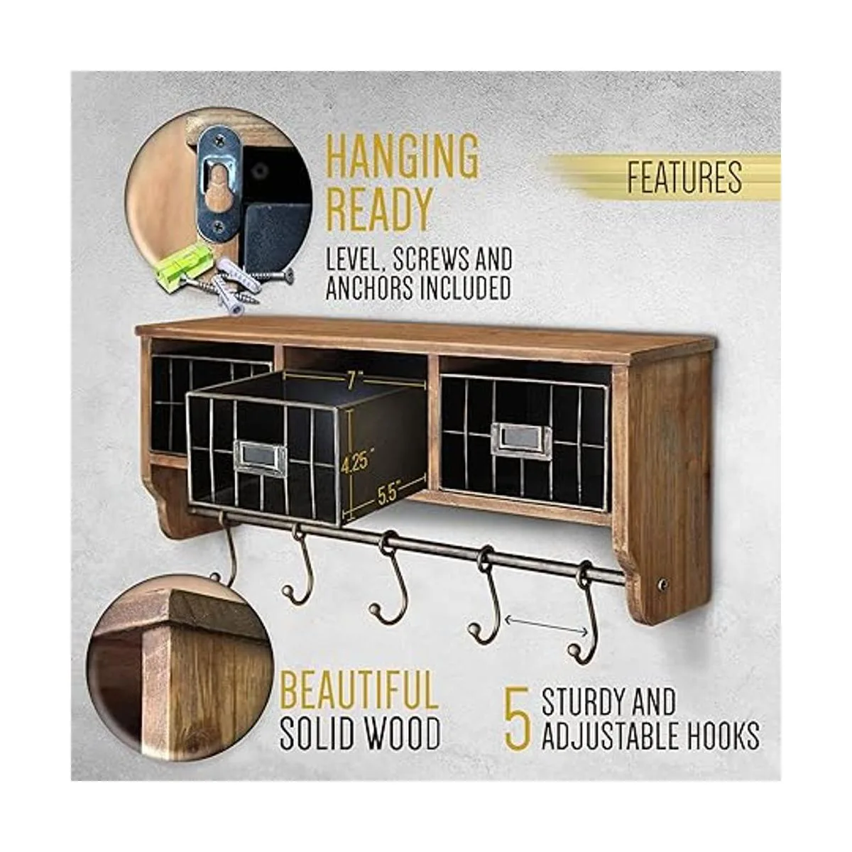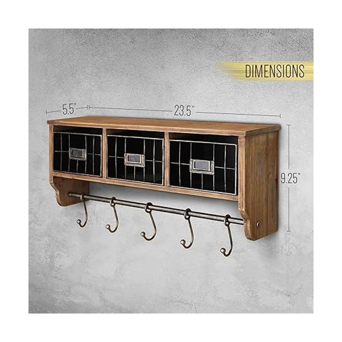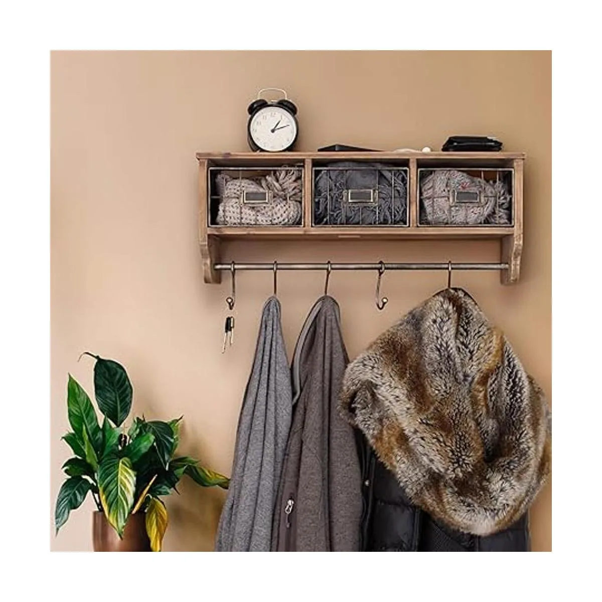 HBCY Creations Perchero rústico de pared con ganchos y cestas, organizador de entrada, estante de pared con 5 ganchos y cubos, estante de madera maciza con ganchos, para colgar abrigos, toallas, sombreros, llaves o tazas de café.