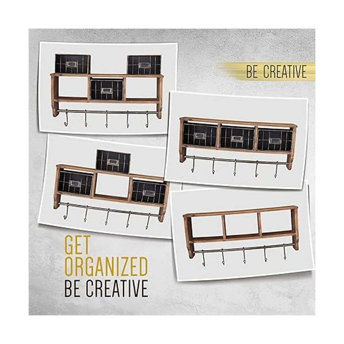 Multiusos: este estante rústico de 61 cm es ideal para todas las áreas. Los 5 ganchos resistentes y el espacioso estante de 14 cm hacen de este organizador de pared la elección perfecta. Añade un toque de belleza rústica a tu entrada, pasillo, cocina, dormitorio o cualquier otro lugar. Las 3 cestas de metal se pueden utilizar en una multitud de formas para expresar tu creatividad mientras te organizas. Retira las cestas por completo para permitir que el color de la pared se muestre a través de él.