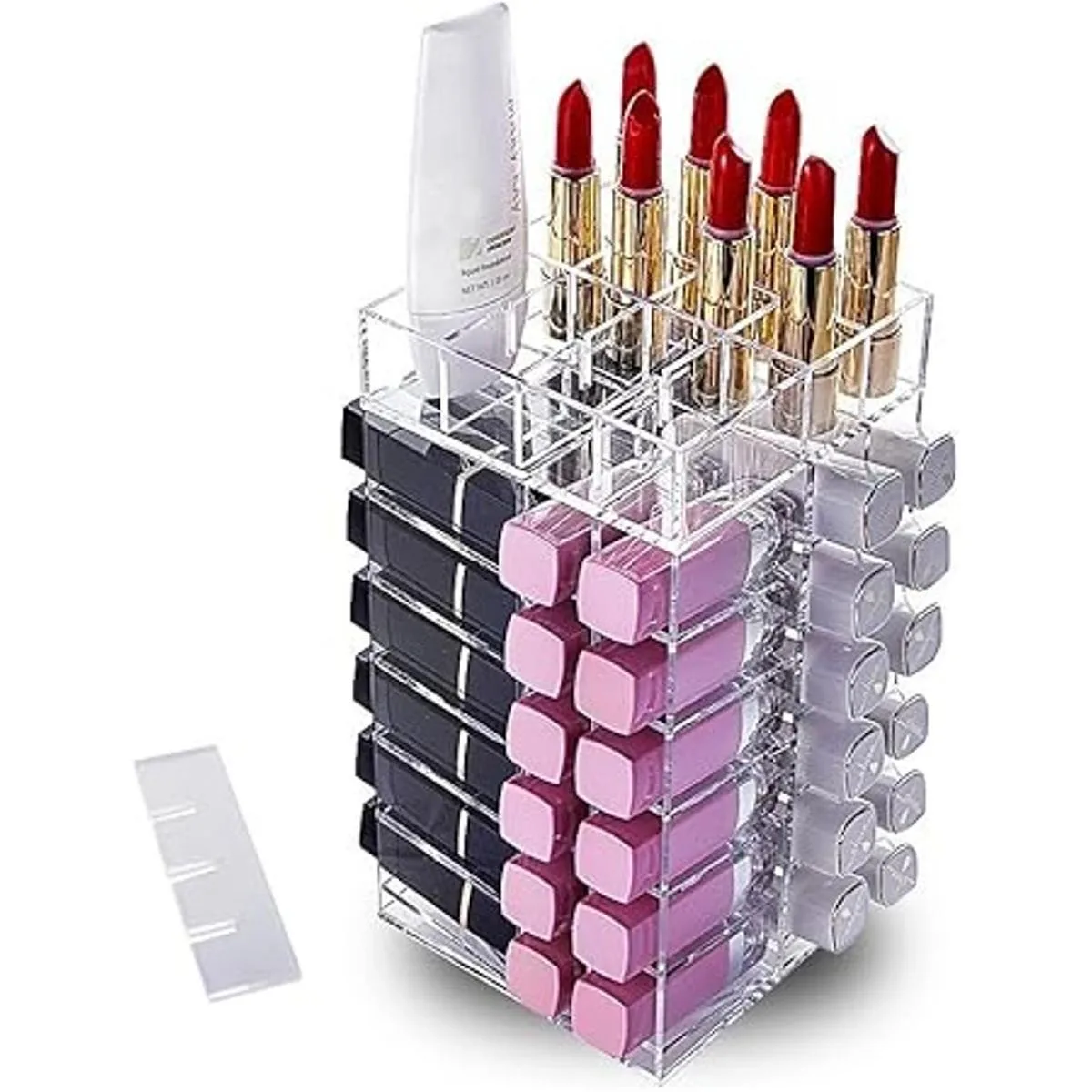 Ahorro de espacio, lo que es ideal para mantener todos sus labios perfectamente organizados en un espacio limitado, y sin la molestia de buscar a través de pilotes de cosméticos en su cajón cada mañana.