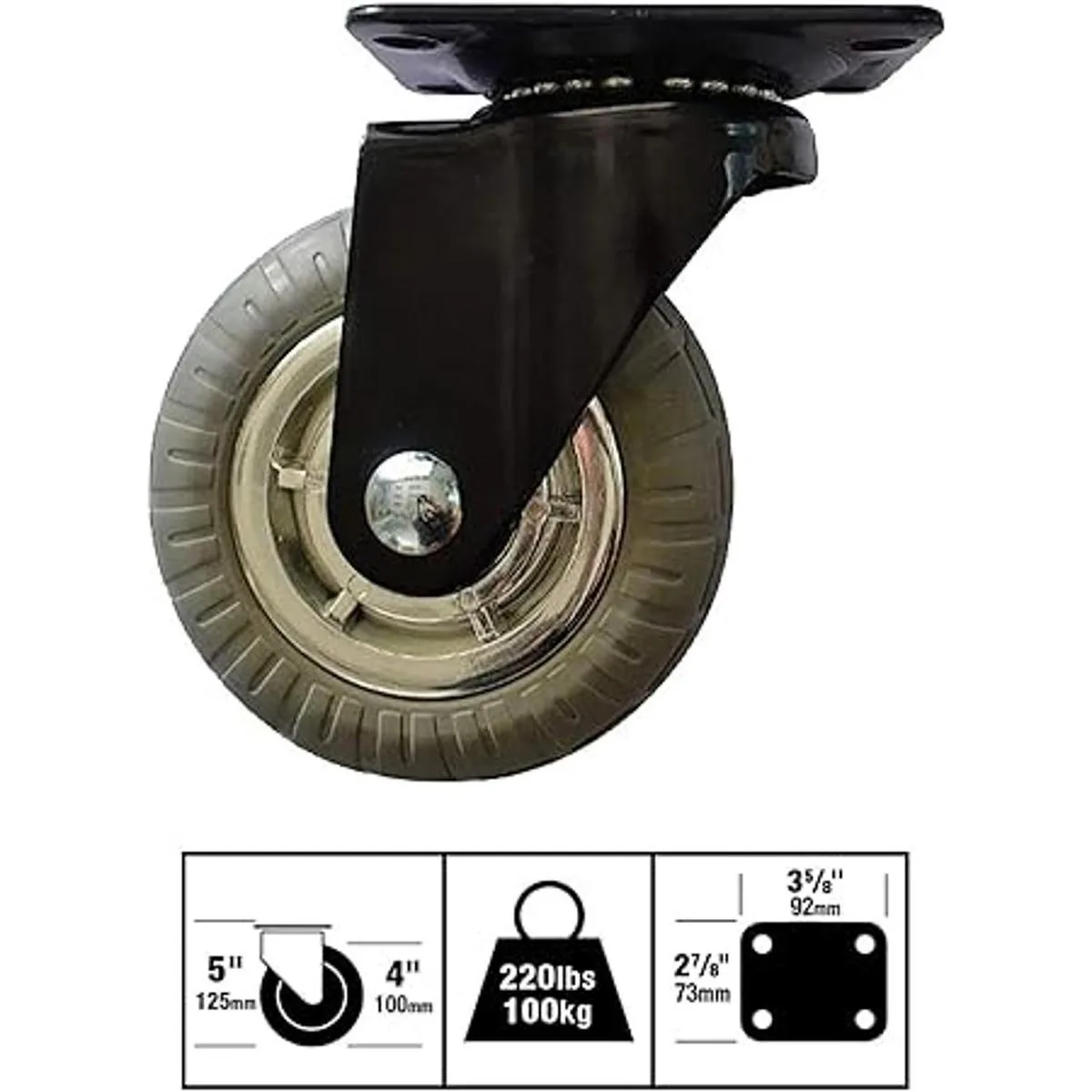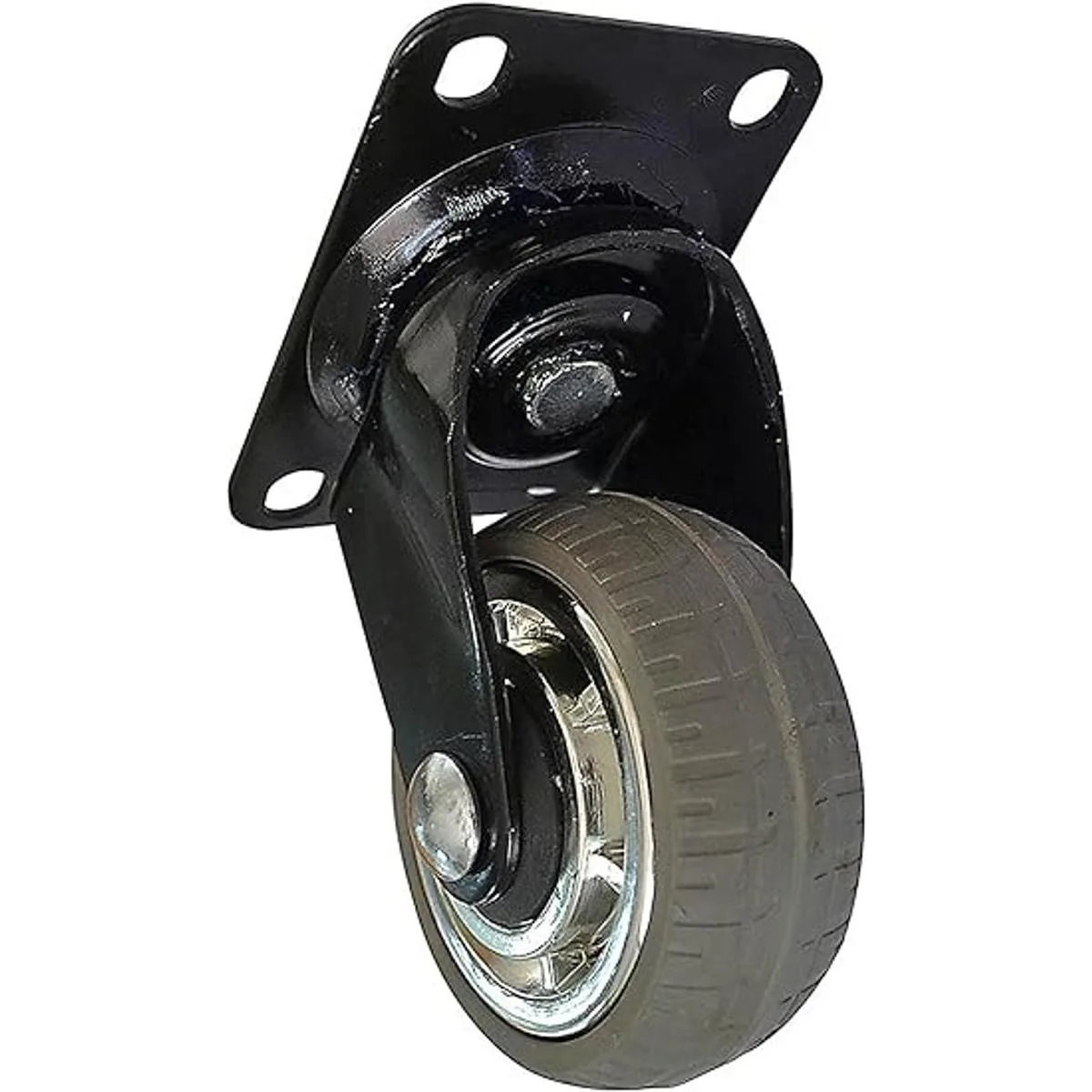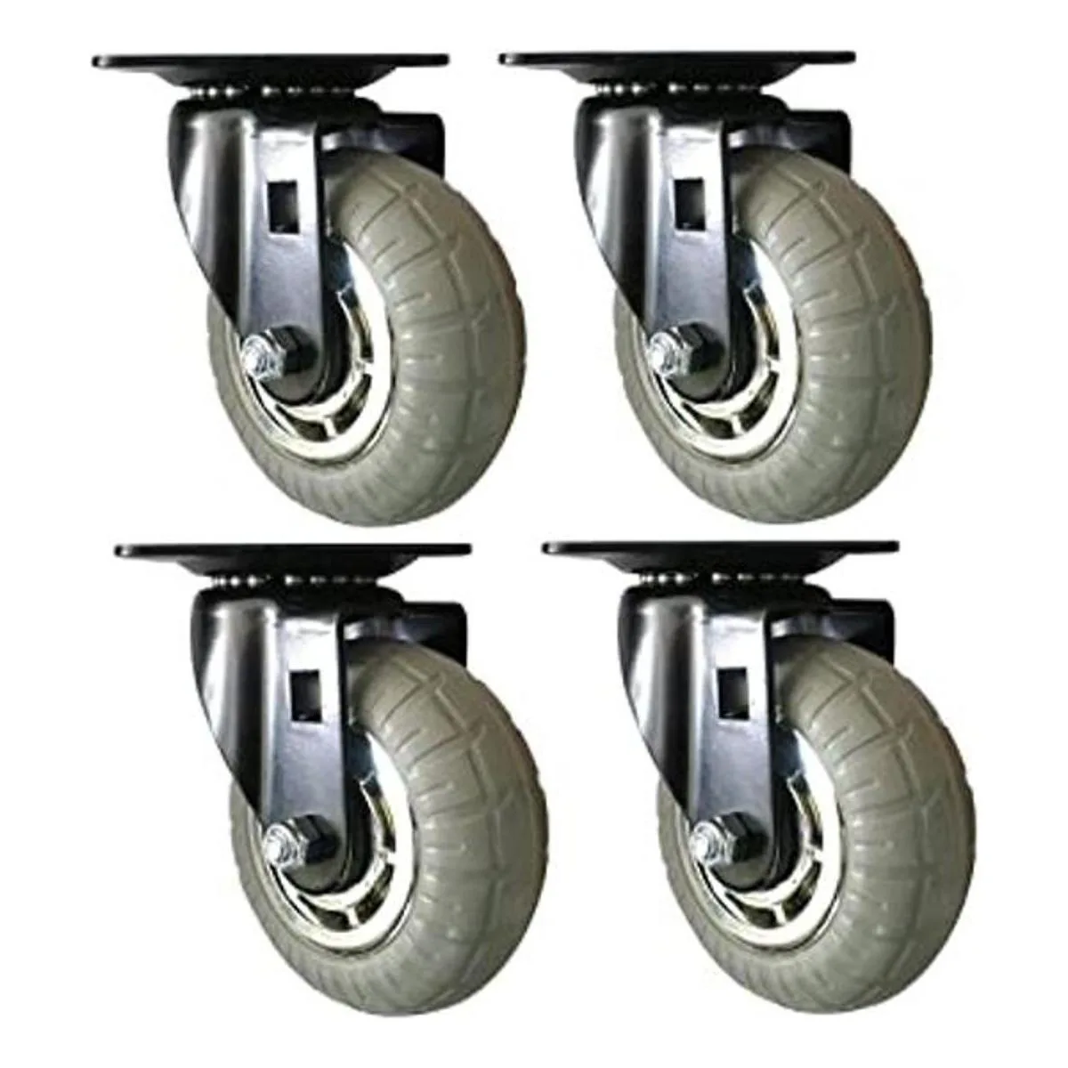 Rueda gris de goma de espuma suave de 11/2 pulgadas de ancho x 4 pulgadas de diámetro con radios cromados y soporte de placa giratoria de doble rodamiento de bolas negro