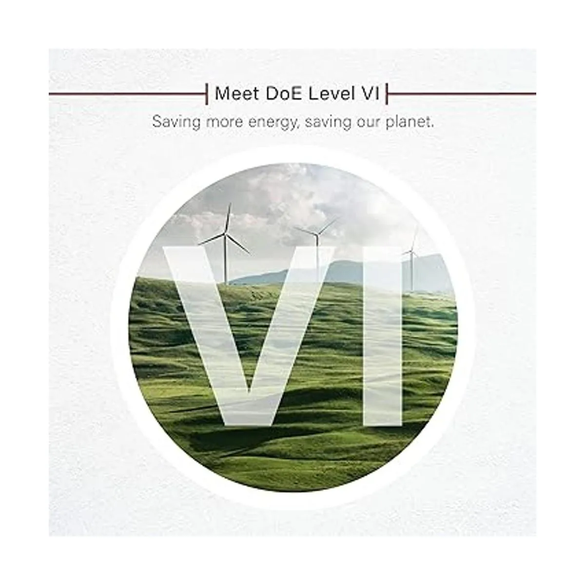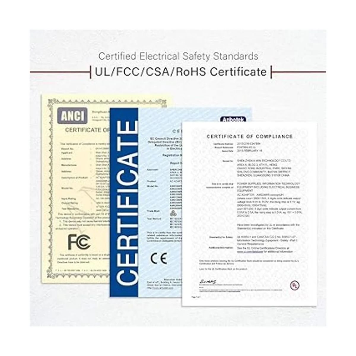 Seguro, listado UL Estándares de seguridad eléctrica certificados: UL 623681, CAN/CSA C22.2 No. 62368, FCC. IEC 62321 RoHS. Ahorro de energía: eficiencia energética de nivel VI, reduce significativamente los requisitos de energía sin carga y aumenta los límites de eficiencia del modo de funcionamiento activo. Los límites de disipación de energía sin carga se cortaron agresivamente a casi un tercio en comparación con el estándar anterior.