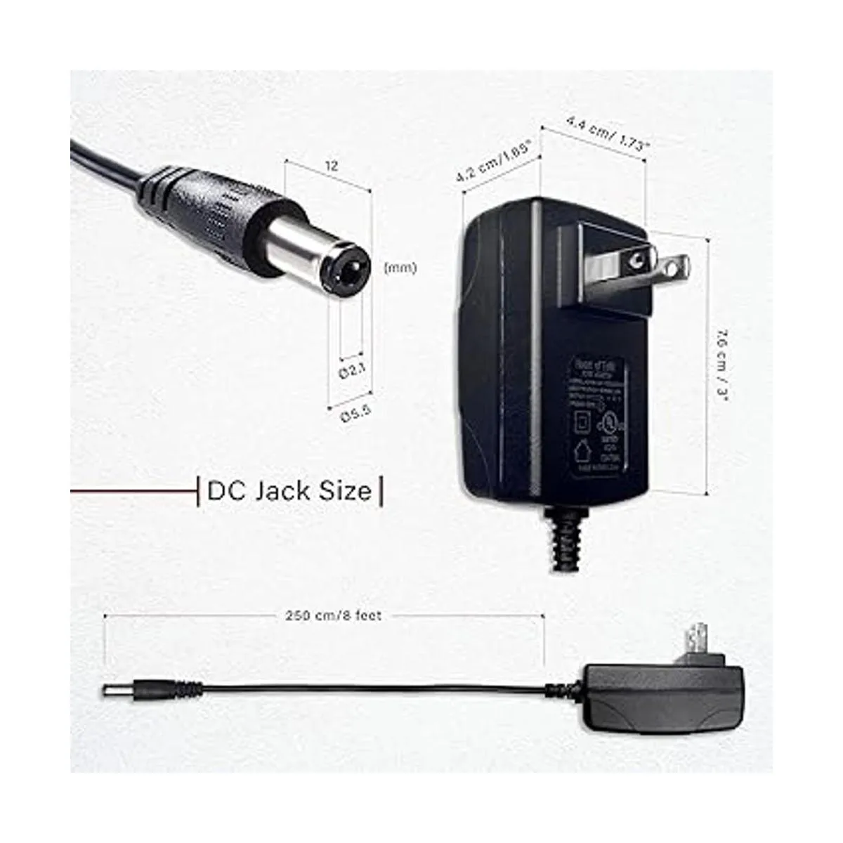 Especificaciones: Voltaje de entrada: CA 100 V240 V 50/60 Hz. Voltaje de salida: 12 V CC 2000 mA 24 W / 8 pies 8.2 ft Cable de alimentación/Tipo de enchufe: 0.217 x 0.083 in CC Power US enchufe de pared, centro positivo, con indicador LED.