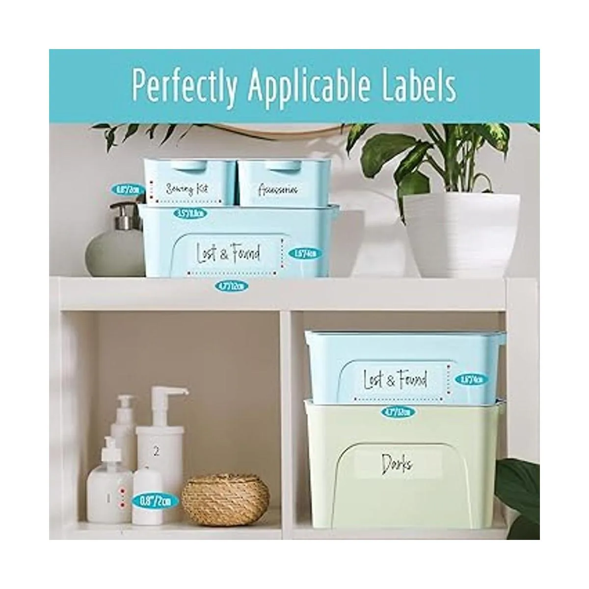 Se adapta a diferentes tamaños: hay 5 tamaños diferentes para las etiquetas cursivas, como 4.7 x 1.6 pulgadas, 4.7 x 1.2 pulgadas, 3.2 x 1 pulgadas, etc. distinguir la longitud de las pegatinas a través de la planificación sistemática según la longitud de la palabra de productos domésticos comunes, que se adapta perfectamente a diferentes tamaños de botellas, contenedores y cestas.