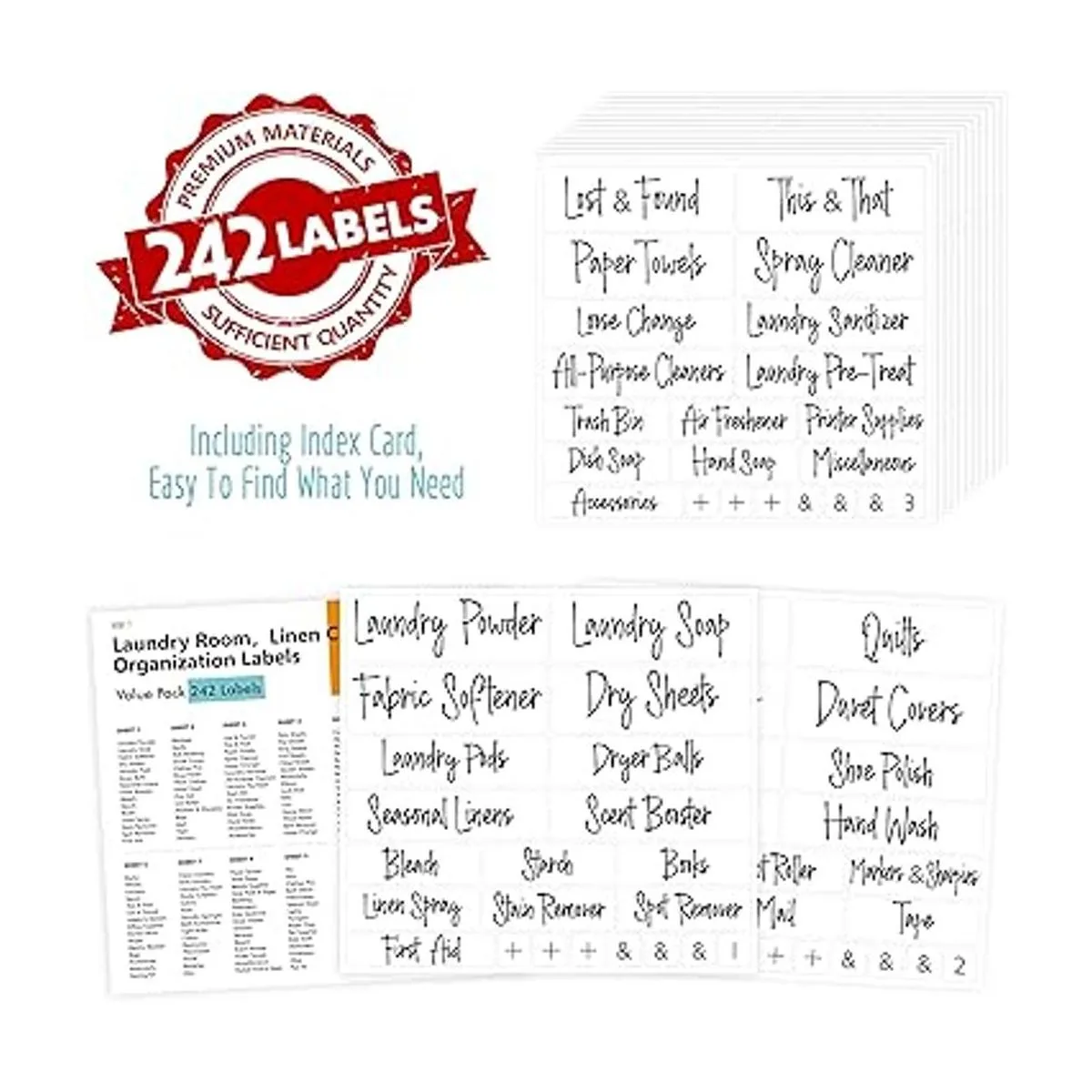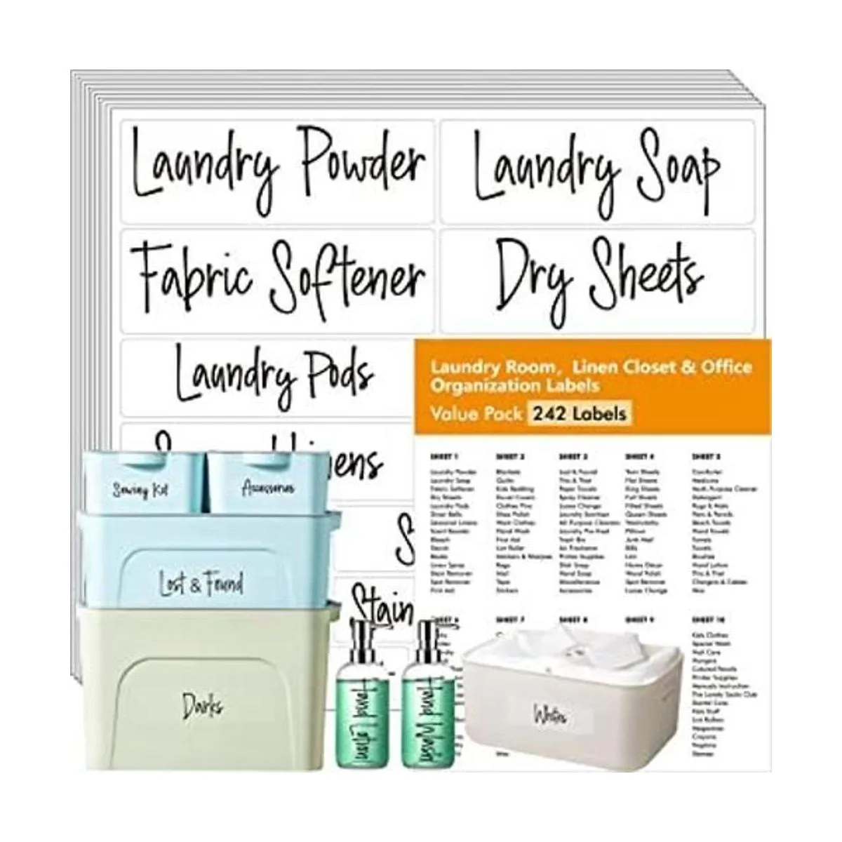 Hebayy 242 etiquetas de lavandería, armario de lino y oficina, 220 calcomanías extraíbles preimpresas impermeables resistentes al aceite y al desgarro, 22 en blanco, sin residuos para organización de habitaciones de manualidades en casa