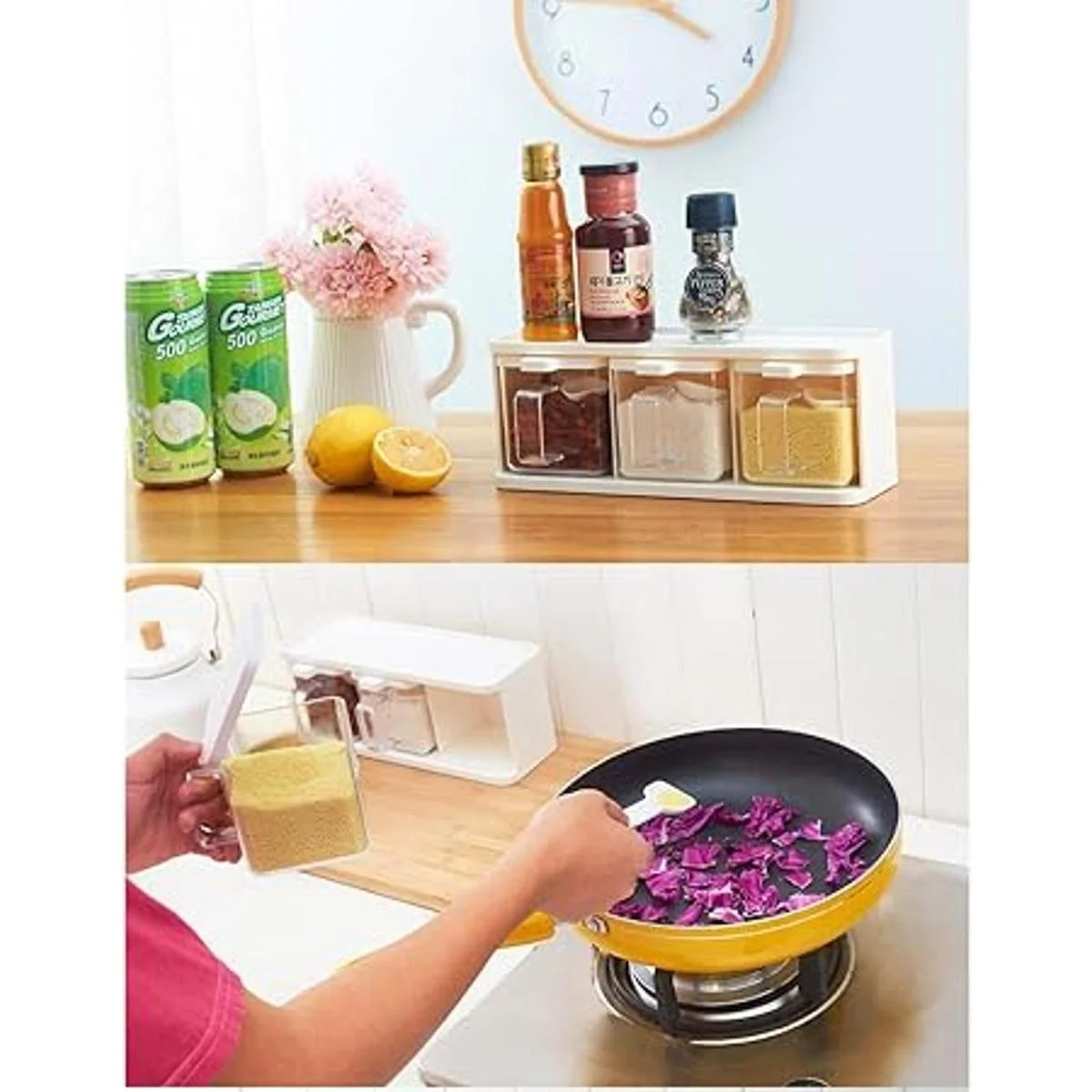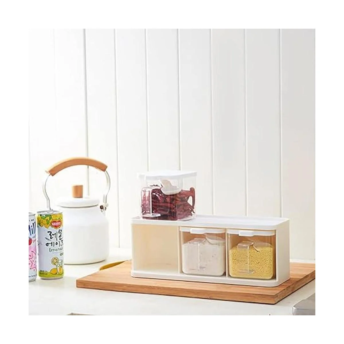 Hedume Paquete de 2 cajas de condimentos transparentes de 3 rejillas con asa y cuchara, juego combinado de contenedores de almacenamiento de condimentos con frascos extraíbles para especias y sal de azúcar