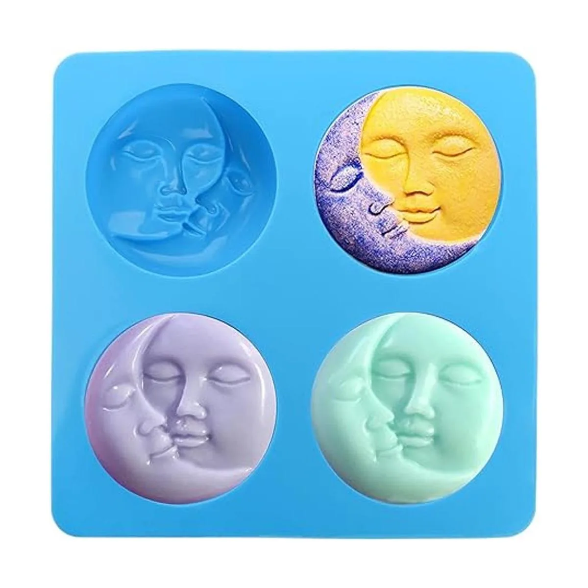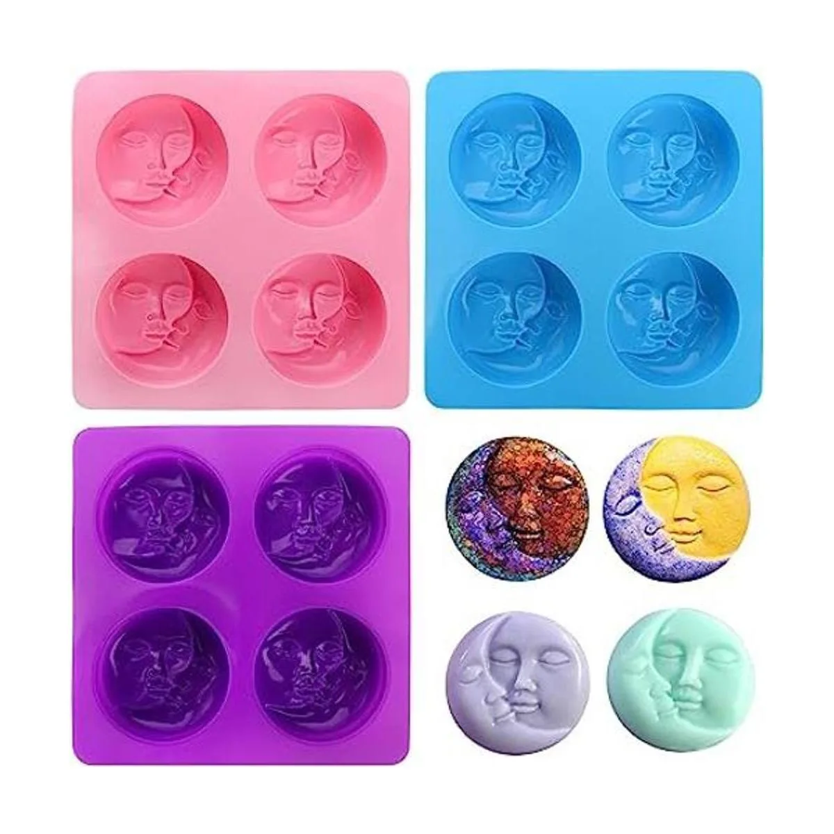 Hedume Paquete de 3 moldes de jabón de silicona para sol y luna, 4 moldes de jabón de cara de sol y luna, molde de jabón de silicona para cara de luna creciente para bombas de baño caseras, barra de loción, arcilla polimérica, fabricación de resina de bricolaje