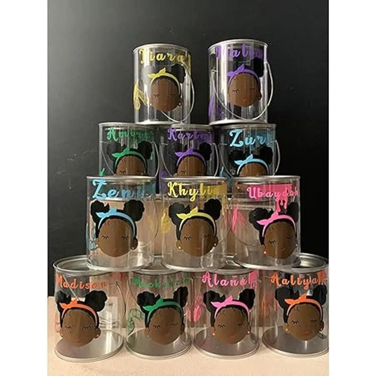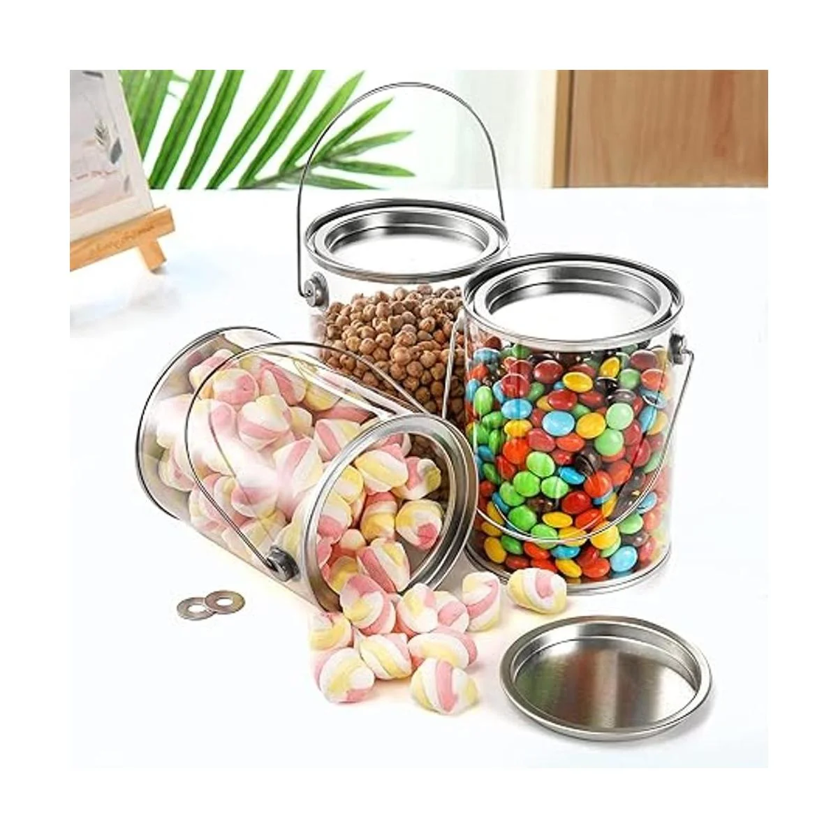 El diseño de este recipiente de plástico transparente se basa en una lata de pintura, pero nuestra versión está diseñada para ser llena con golosinas, recuerdos de fiesta o baratijas y presentada a tus invitados de fiesta.