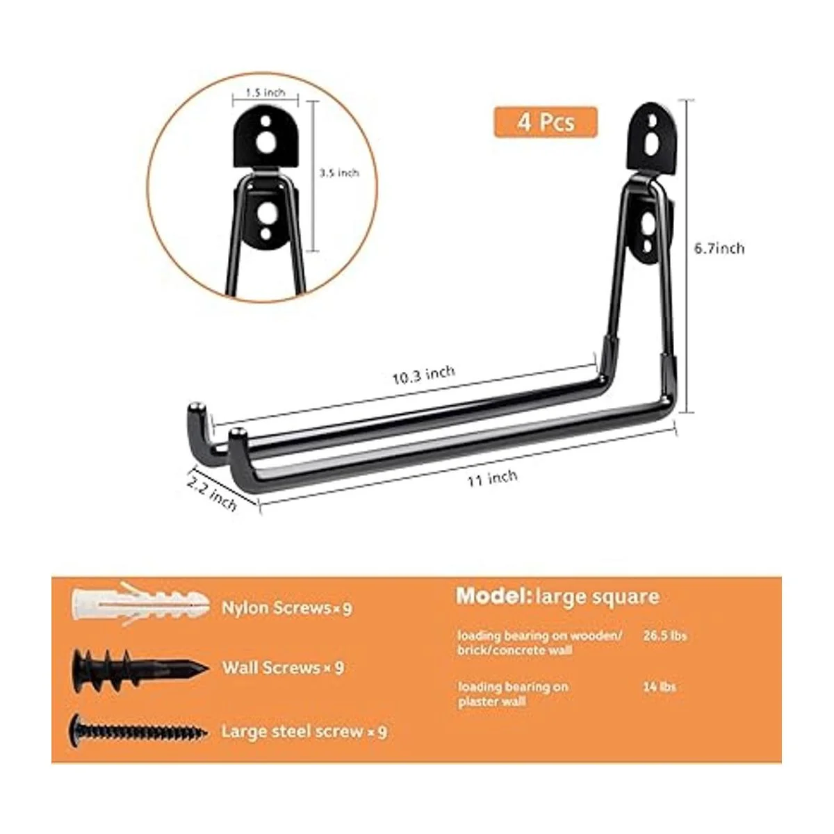 Garantía de calidad y servicio posventa: proporcionamos 30 días de completo y 365 días de garantía de calidad para ganchos de montaje en pared de garaje, el paquete incluye 4 ganchos de garaje grandes de alta resistencia, 9 juegos de tornillos y 9 tapones de pared, 1 instrucción de instalación.