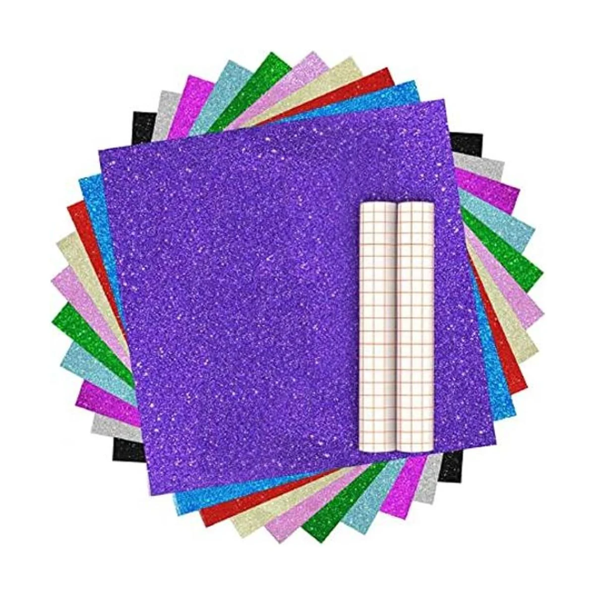 Heflashor Vinilo adhesivo con purpurina para manualidades, 12 hojas de vinilo adhesivo permanente brillante para manualidades, 12 x 10 pulgadas, vinilo adhesivo con purpurina para suministros de álbumes de recortes con 2 hojas de cinta de transferencia