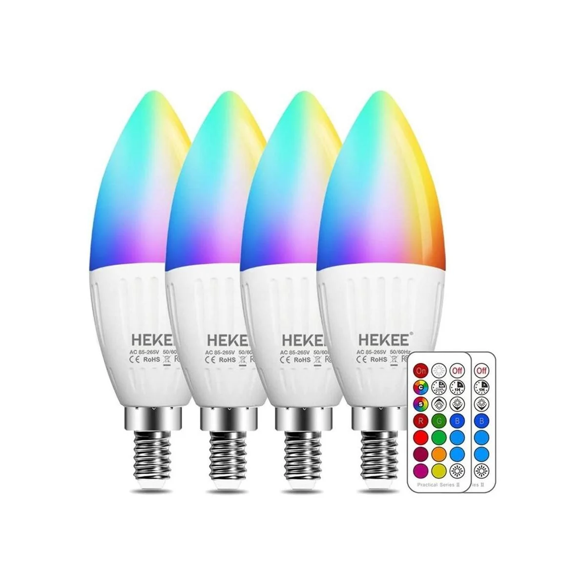 HEKEE Bombillas LED de candelabro E12, vela que cambia de color, equivalente incandescente de 40 W, 450 lúmenes, RGB blanco cálido de 2700 K, 5 vatios, 12 colores, 2 modos, temporizador, control remoto paquete de 4
