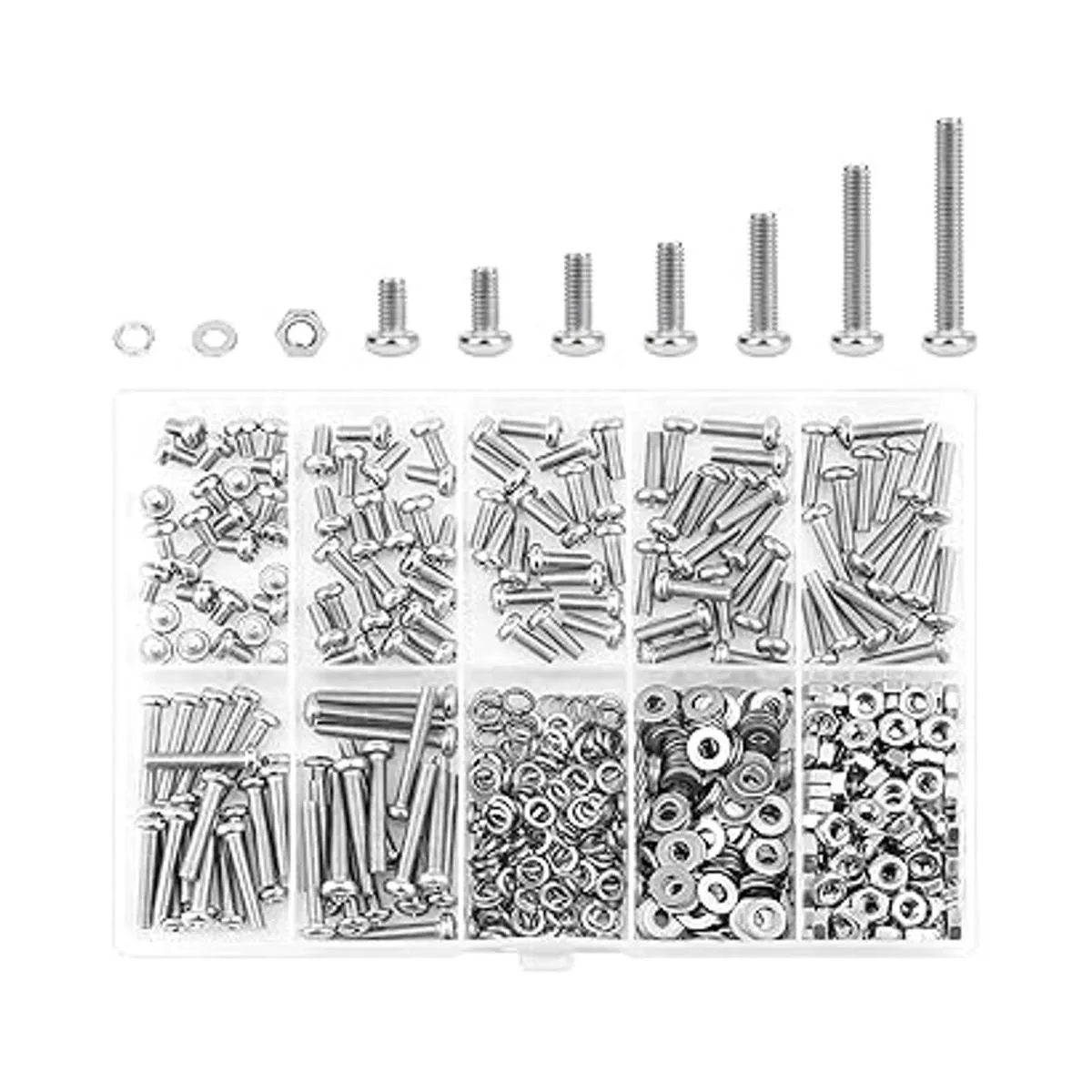 Tamaños: tornillos Phillips M3 x 0.157 in, 0.236 in, 0.315 in, 0.394 in, 0.472 in, 0.630 in, 0.787 in con tuercas hexagonales a juego, arandelas de bloqueo y arandelas planas, total 7 tamaños, diferentes tamaños pueden satisfacer tus diferentes necesidades.